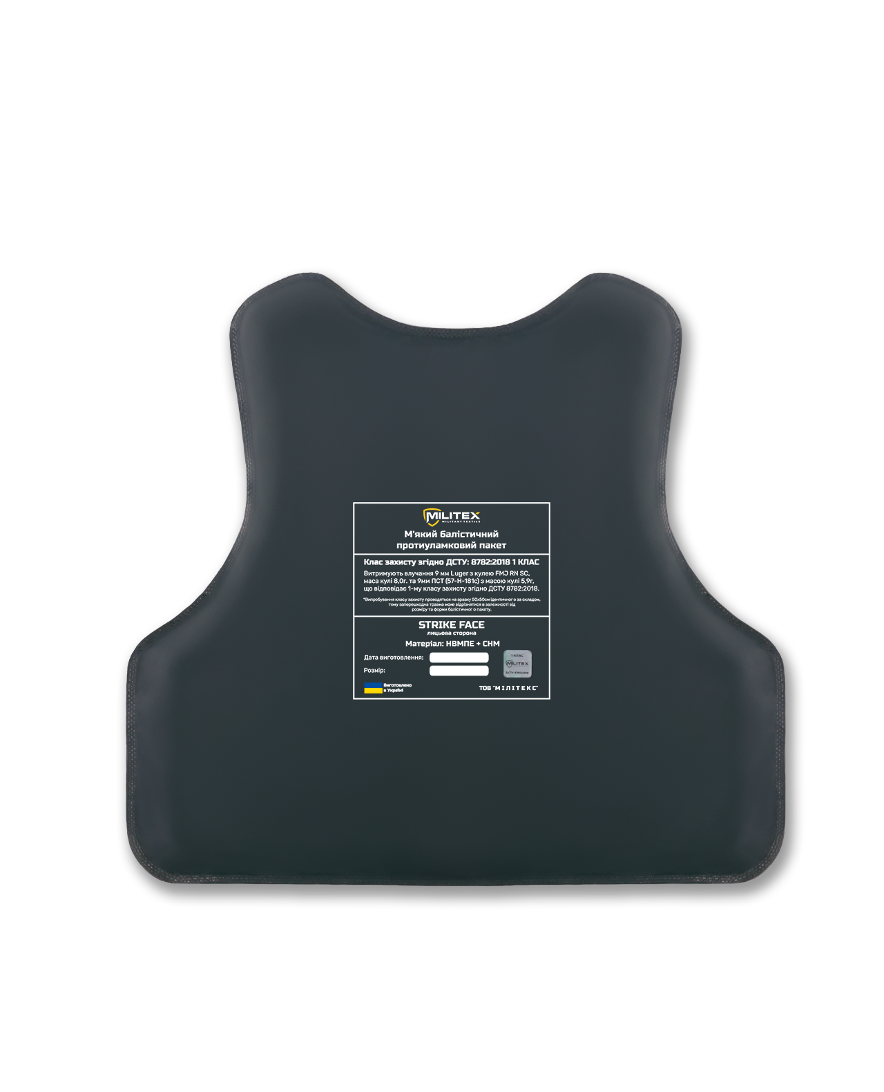 - шаром 9х19 мм Luger (скорость 401±1 м/c) в цельнометаллической оболочке из медного сплава с носовой частью полусферической формы с мягким (свинцовым) сердечником в соответствии с требованиями п. 6.1.2. (при нормальных условиях эксплуатации), п. 7.1. 1, табл. 1 ДСТУ 8782:2018 Средства индивидуальной защиты. Бронежилеты.”, относительно 1 класса защиты; максимальная глубина внепрепятственной деформации – 20,0 мм.