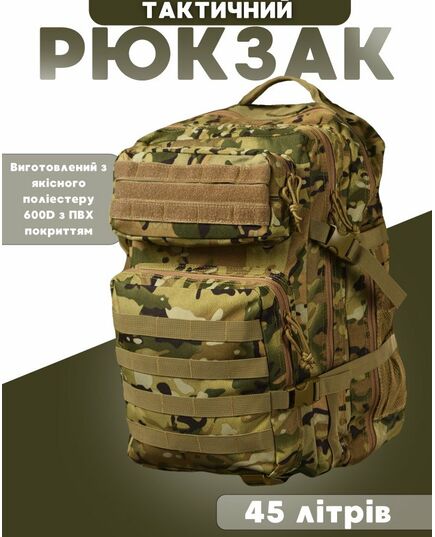 Изготовлен из качественного полиэстера 600D с ПВХ покрытием, что обеспечит защиту от механических повреждений. Спереди рюкзак снабжен системой MOLLE, что позволит при необходимости увеличить его объем дополнительными подсумками.