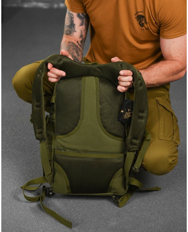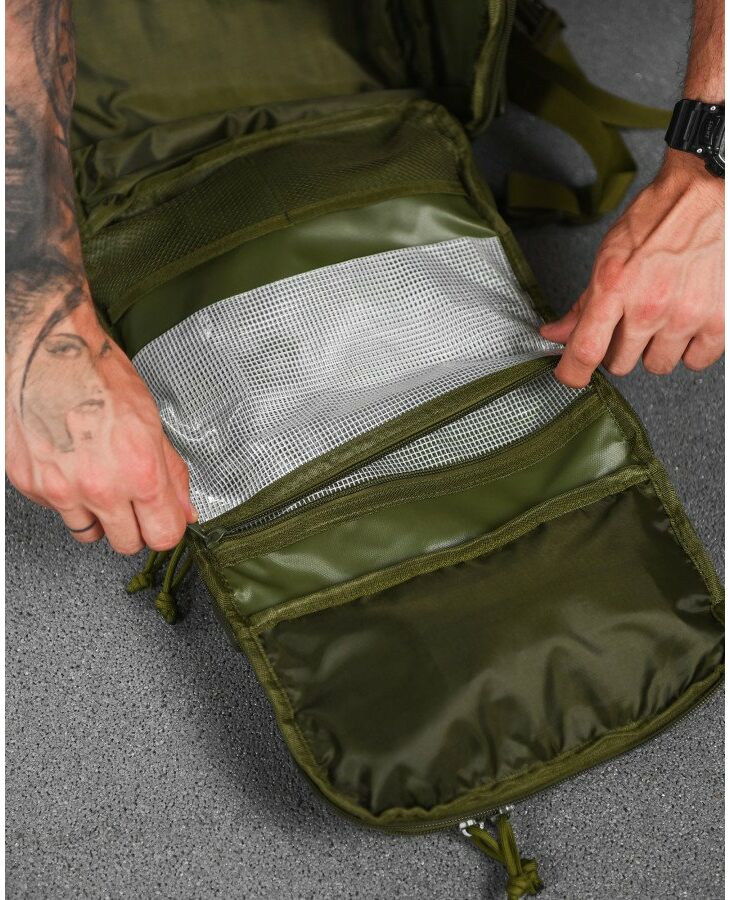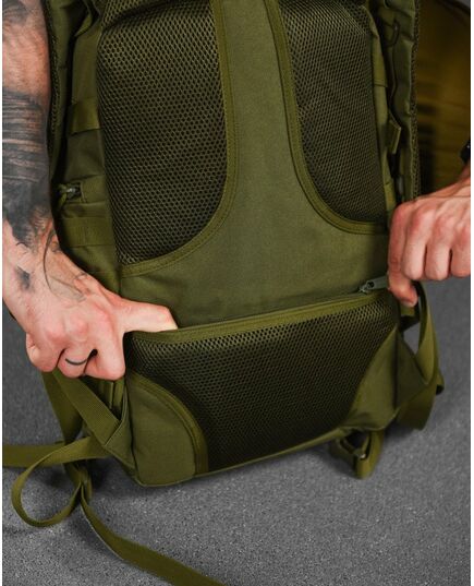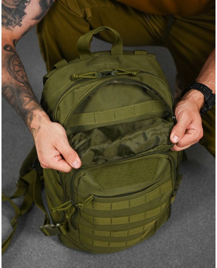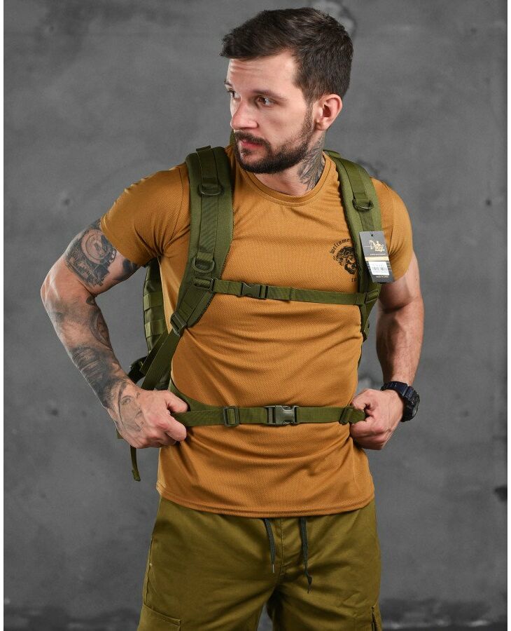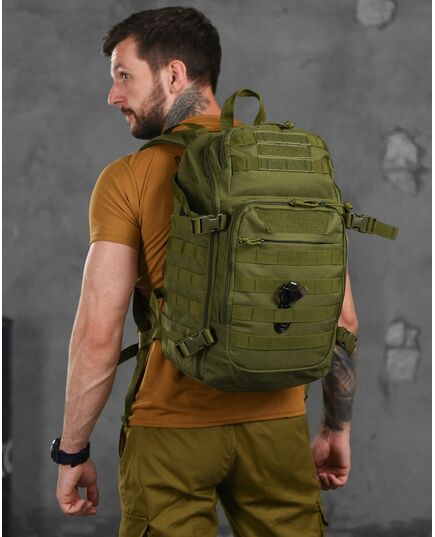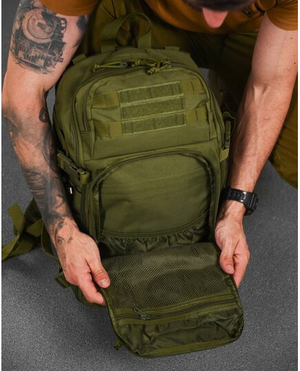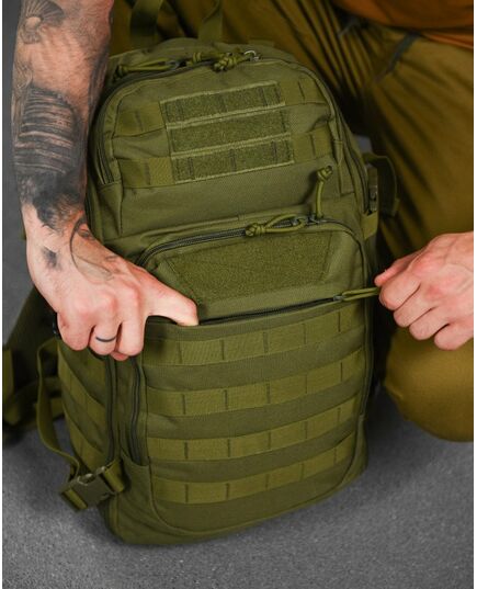 Рюкзак тактический изготовлен из оксфорда 600D. Это достаточно прочный материал, обладающий устойчивостью к влаге. Рюкзак тактический обладает системой крепления MOLLE, позволяющей крепить к нему необходимое снаряжение в любом удобном для вас месте.