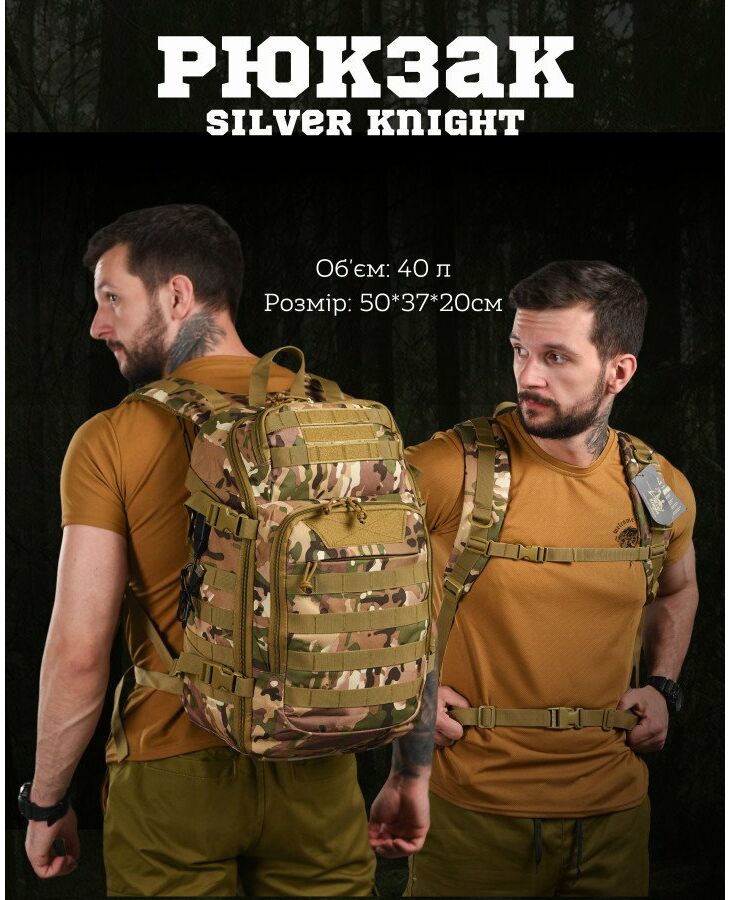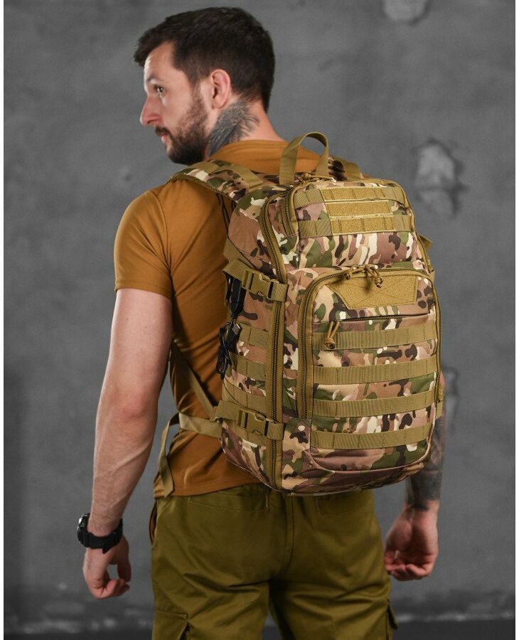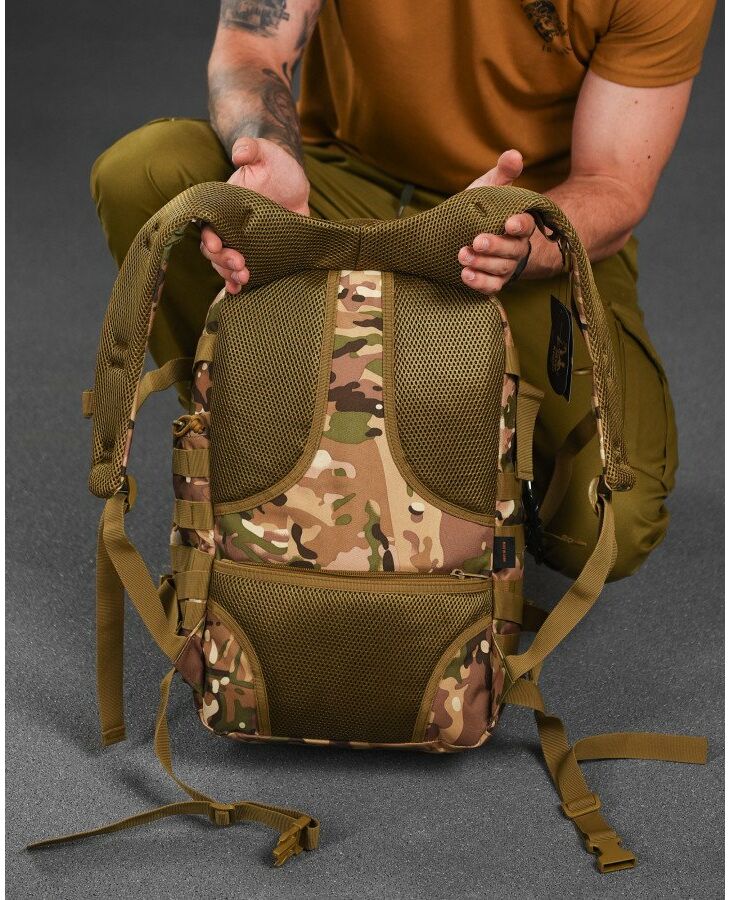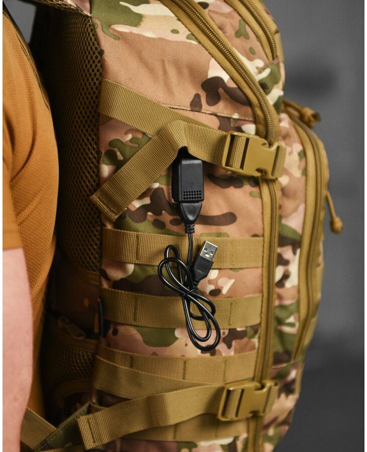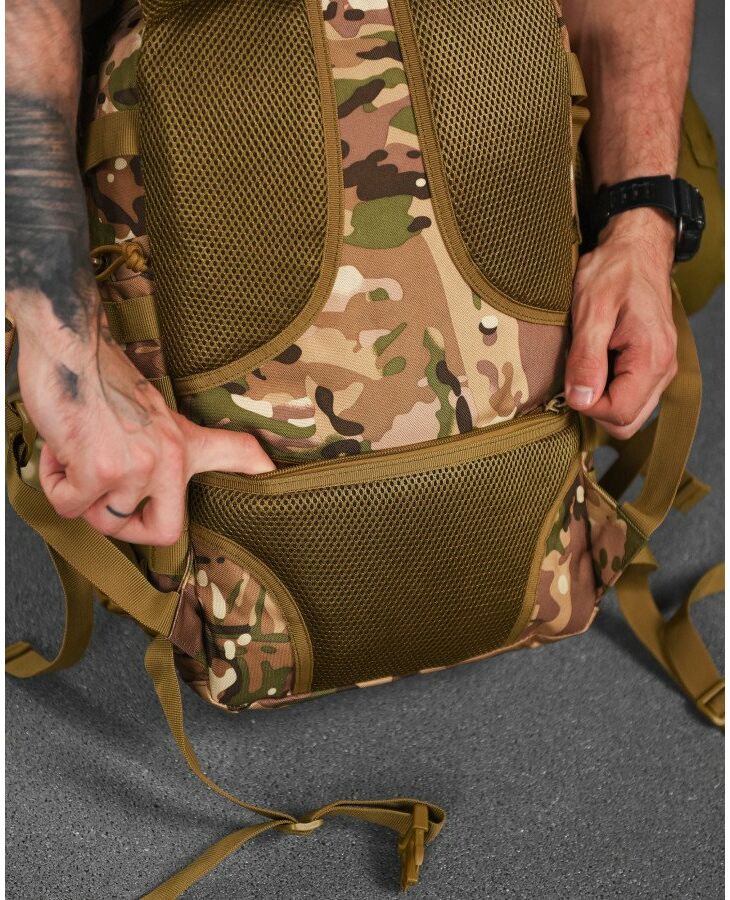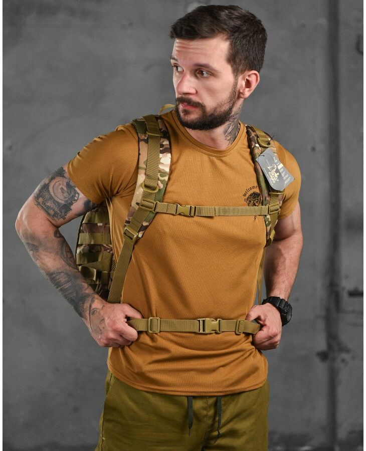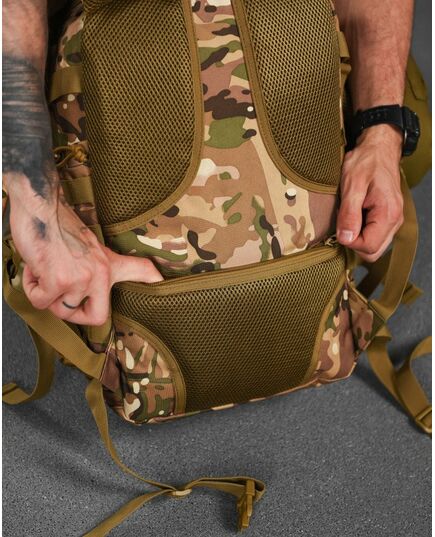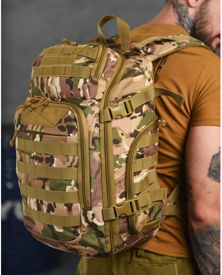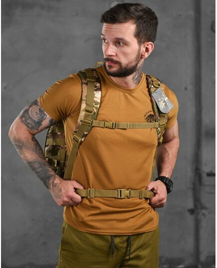 Рюкзак тактический изготовлен из оксфорда 600D. Это достаточно прочный материал, обладающий устойчивостью к влаге. Рюкзак тактический обладает системой крепления MOLLE, позволяющей крепить к нему необходимое снаряжение в любом удобном для вас месте.