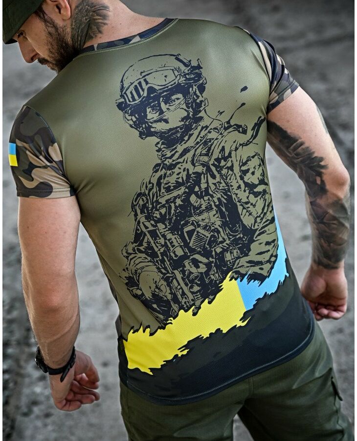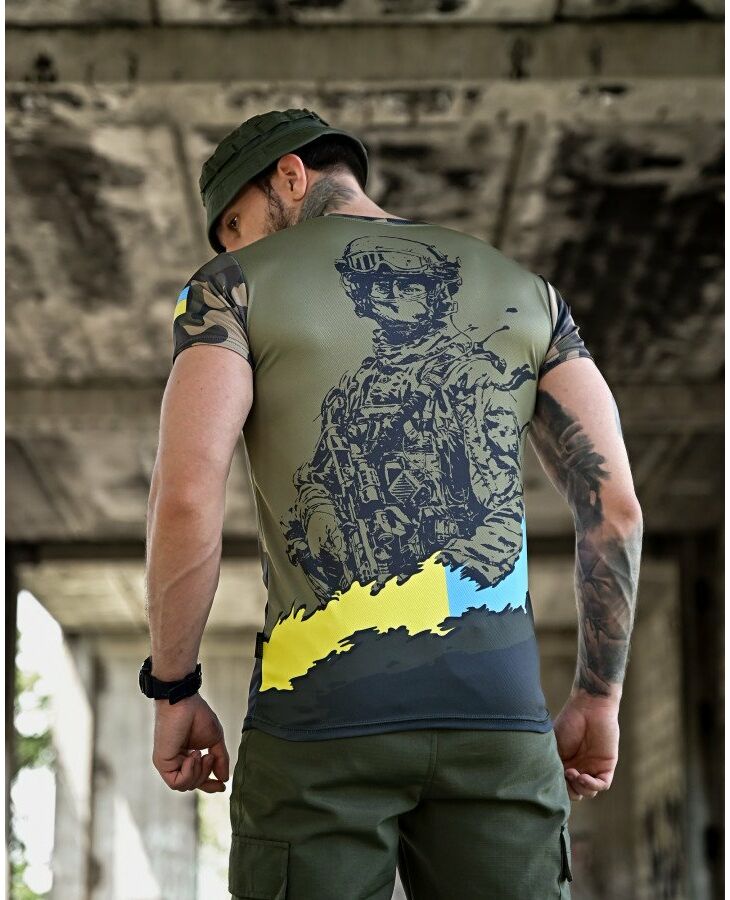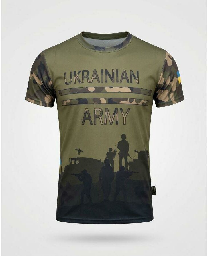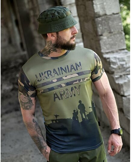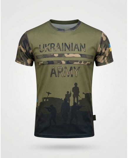Дизайн выполнен в милитари-стиле: на спине изображены боевые вертолеты и силуэты бойцов, а на груди — агрессивный графический элемент, подчеркивающий характер и силу. Рисунок нанесен методом шелкографии, что обеспечивает долговечность и стойкость к стиркам.