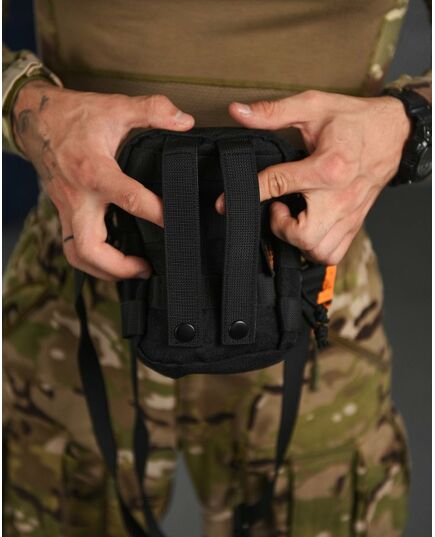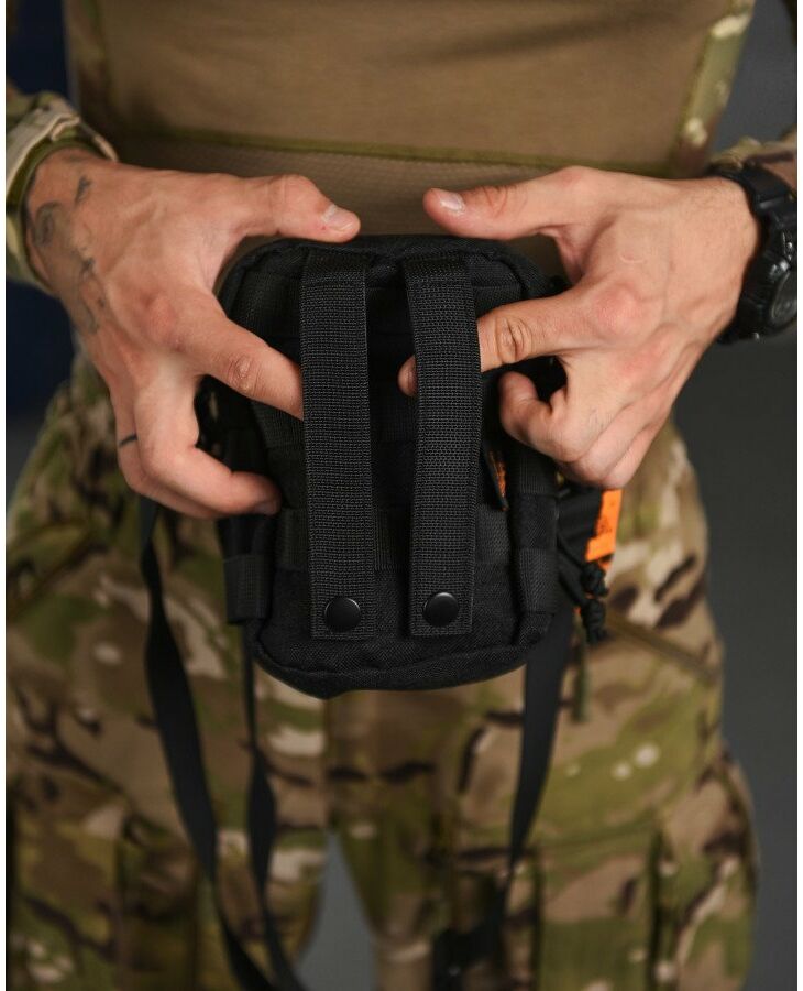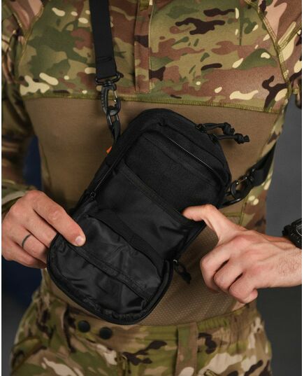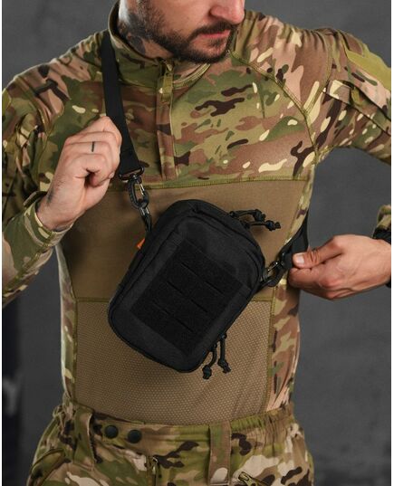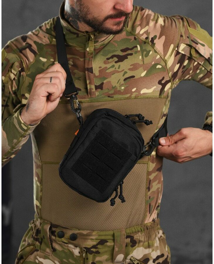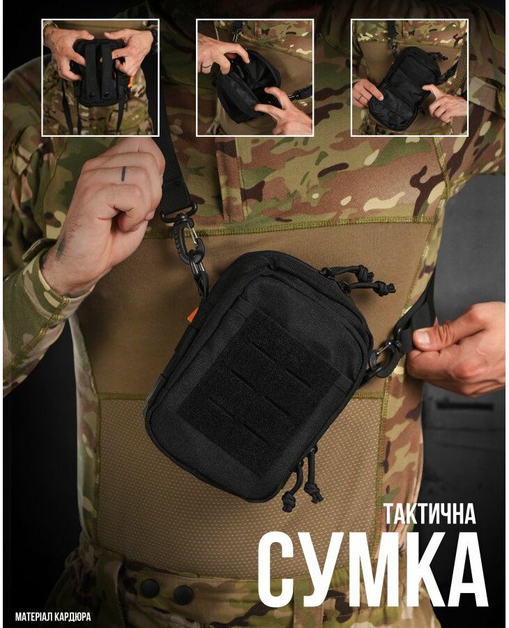 Сумка имеет вместительный основной отдел, три фронтальных кармана и один большой карман на тыльной стороне. Все отделы закрываются на молнию. Удобная широкая плечевая лямка крепиться к сумке удобными карабинами. На лицевой части присутствует D-образное кольцо, а на боках сумки нашиты прочные нейлоновые стропы, к которым можно прикрепить дополнительные аксессуары или подсумки. Нейлон, из которого пошита сумка, неплохо держит воду и устойчив к износу. Благодаря компактному размеру, большому количеству карманов и возможности крепления дополнительных аксессуаров, данная сумка найдёт отличное применение в военно-тактических действиях, туризме, охоте и рыбалке....