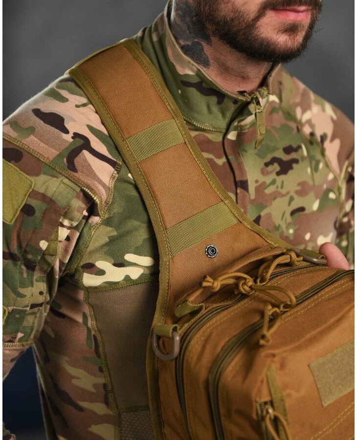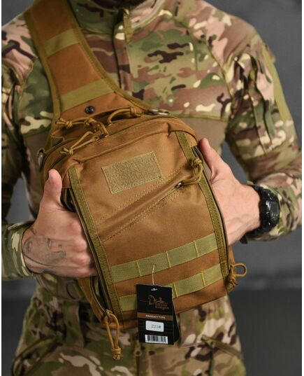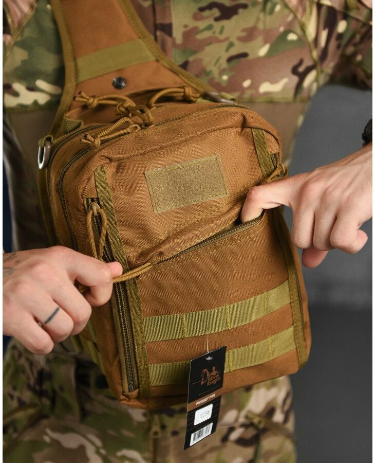 Тактическая сумка на плечо выполнена из прочной ткани, качественный пошив и фурнитура. Имеет одно основное отделение и два дополнительных кармана.