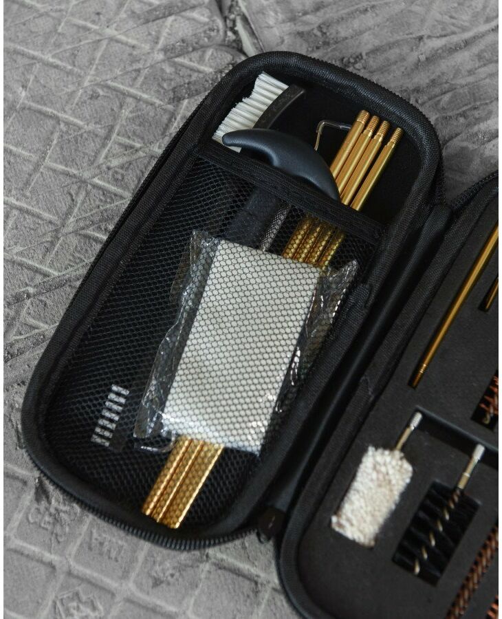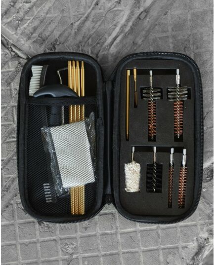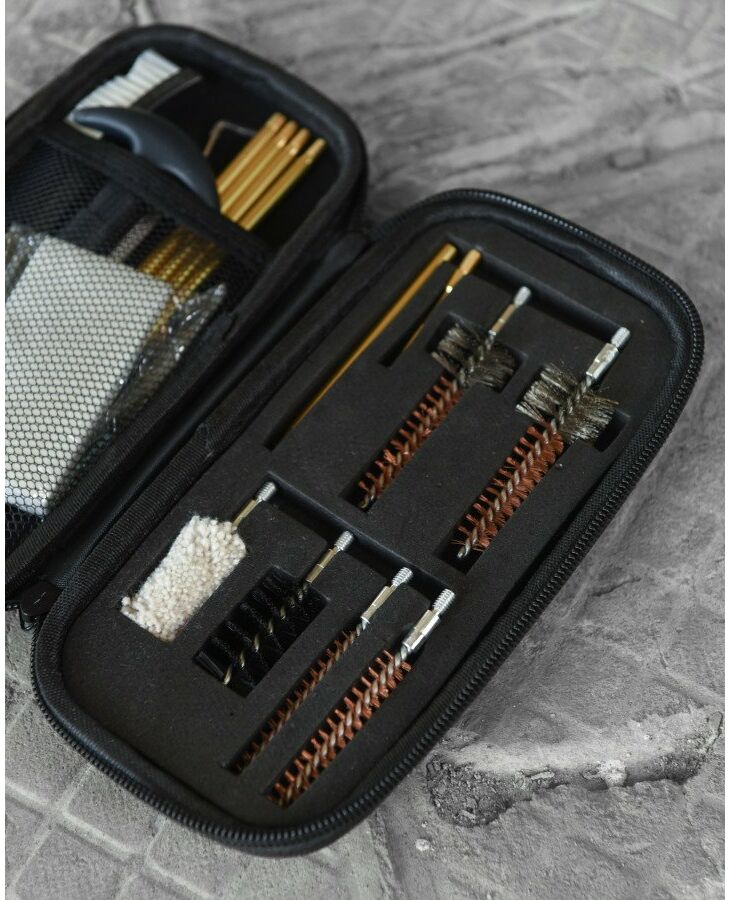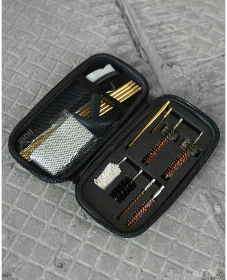 Состав набора: - шомпол с 4-мя насадками - 2 медные щетки - 2 ершика для чистки патронника - пушок - вешалка - щетка пластиковая - зацеп - ерш нейлоновый - вешалка - салфетка