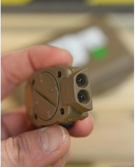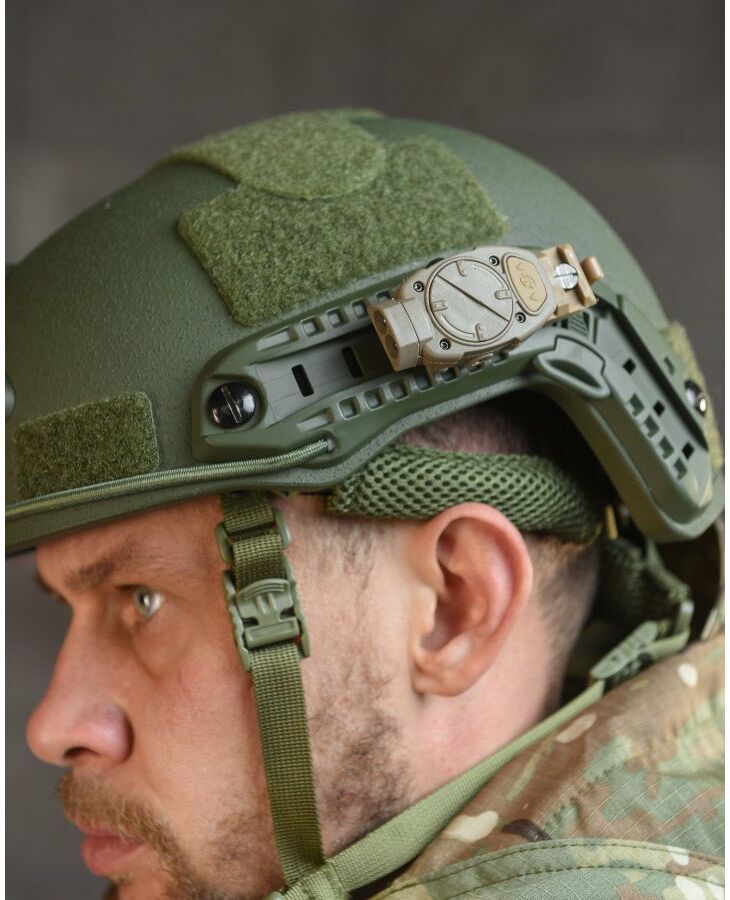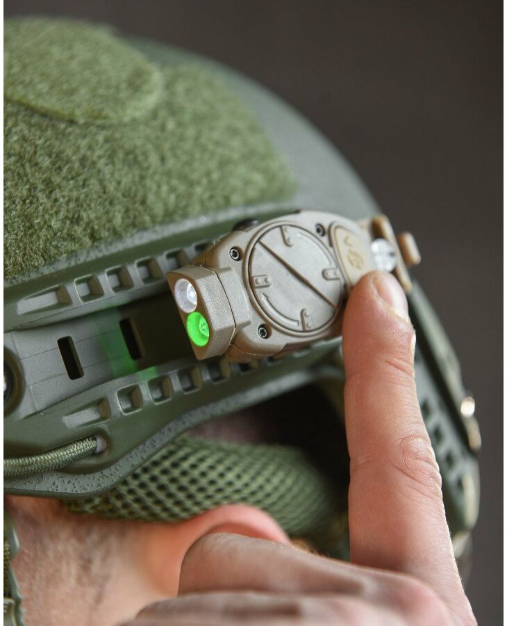 Тактический фонарик на шлем оснащен режимами красного и белого света. Он совместим с большинством шлемов, таких как MICHT, FAST и их аналоги, крепится сбоку на рейку. Этот фонарь также можно установить на оружие благодаря креплению для планки Пикатини, которое входит в комплект. Устройство оснащено тремя белыми и двумя красными светодиодами с регулируемой яркостью. На боковой части расположен инфракрасный маячок IFF, обеспечивающий идентификацию союзных сил через дроны, приборы ночного видения и другие специальные оптические устройства. Питание осуществляется от батарейки CR123A, которая идет в комплекте.