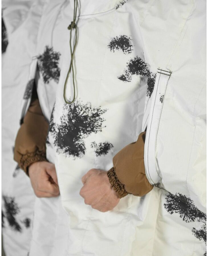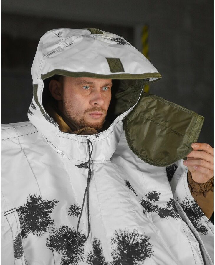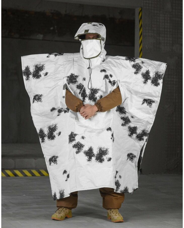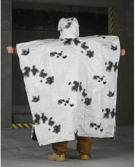 Пончо, разработанное для максимальной защиты от тепловизоров, представляет собой двухстороннюю конструкцию с основанием Pixel и белым кляксовым рисунком.