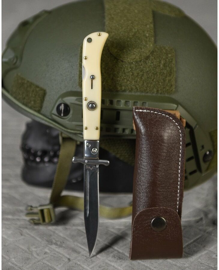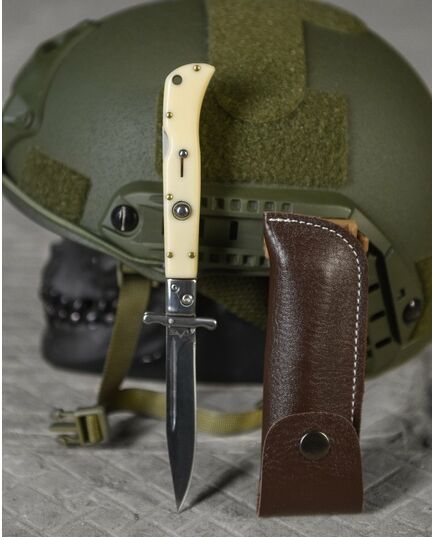 Удобным будет и "кнопочный" механизм открывания клинка, а для безопасности предусмотрен специальный фиксатор-ползунок от случайного нажатия, расположенный на рукояти. Сама же ручка выполнена из дерева, что дает отлично сцепление с ладонью, а также придает особый внешний вид.