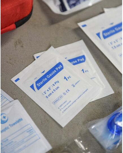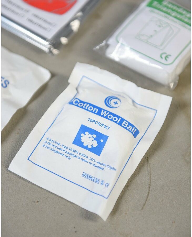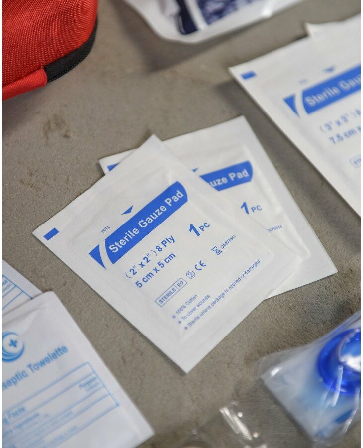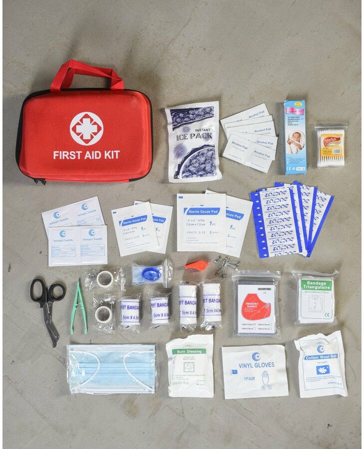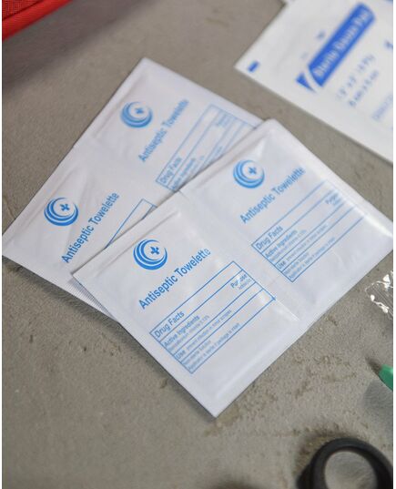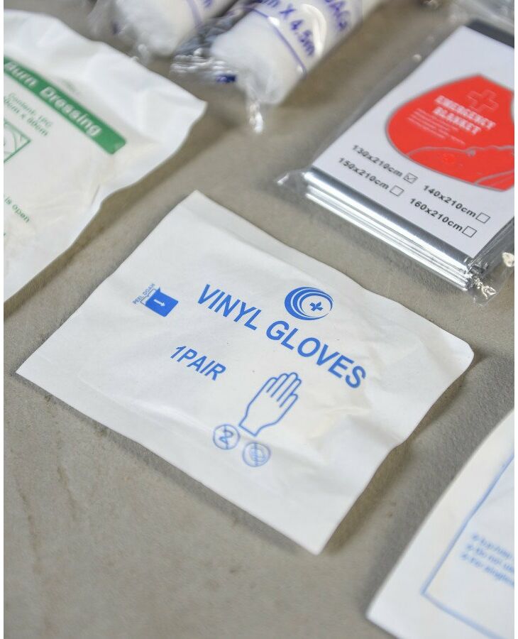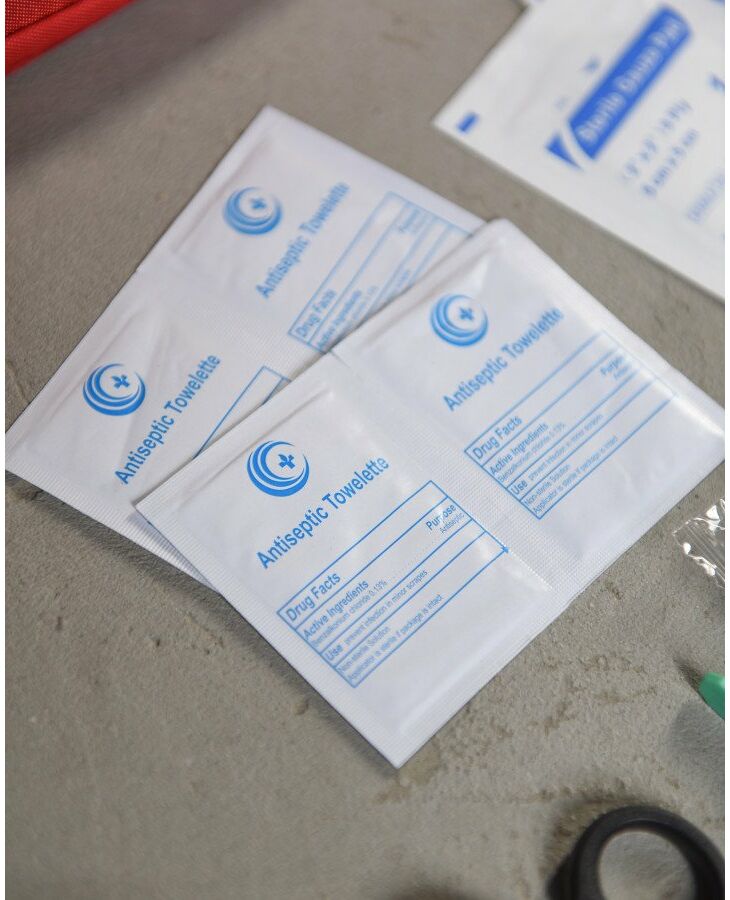 - Предметы гигиены и ухода, такие как антисептические салфетки, спиртовые и йодные салфетки, виниловые медицинские перчатки и крем от ожогов.