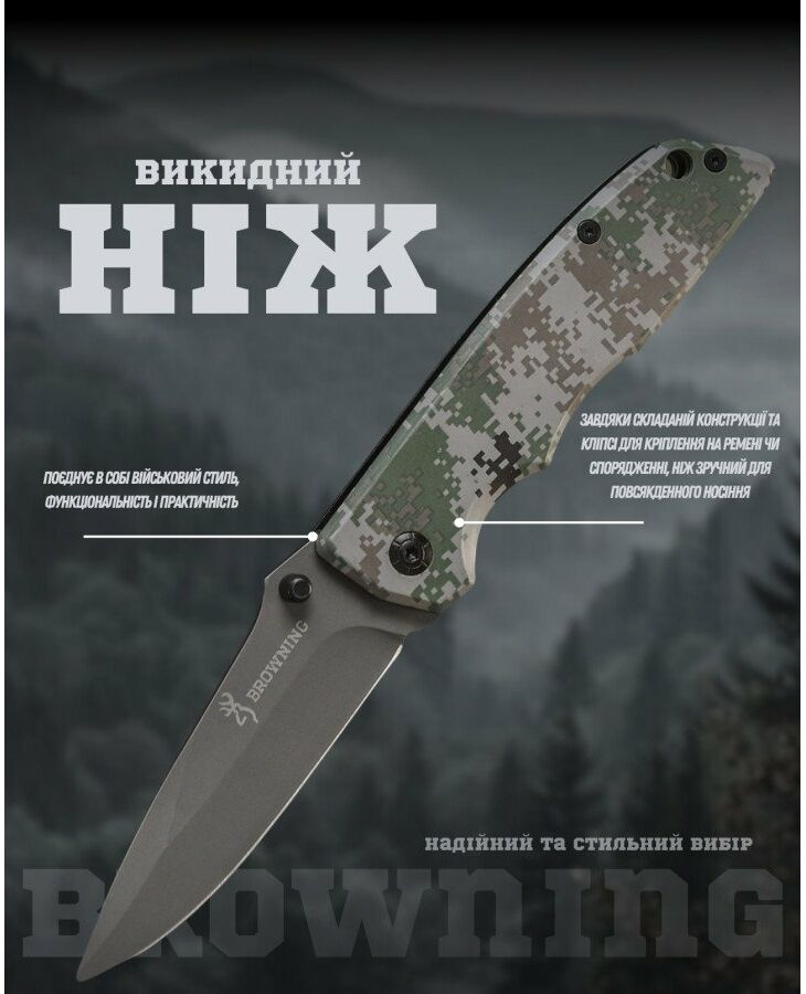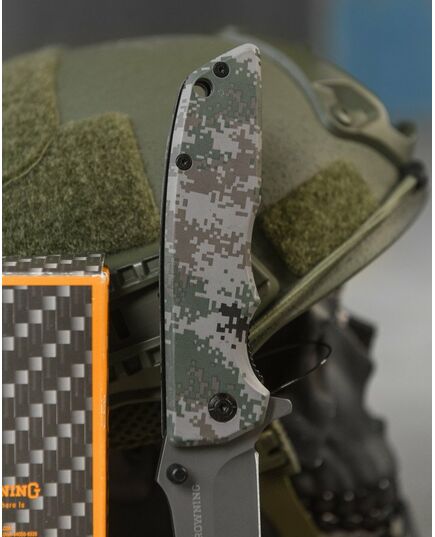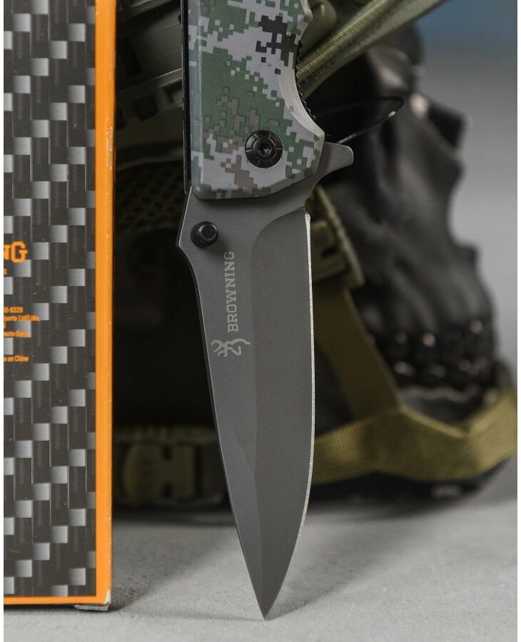 Складной нож Browning в стиле милитари с камуфлированной рукоятью — надежный и стильный выбор, который особенно ценят военные и любители активного отдыха. Лезвие из прочной нержавеющей стали обладает высокой стойкостью к коррозии и долго сохраняет остроту, что делает его незаменимым помощником в полевых условиях, походах, на рыбалке или охоте.