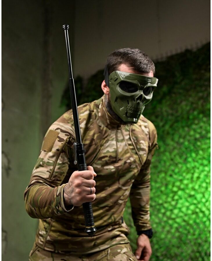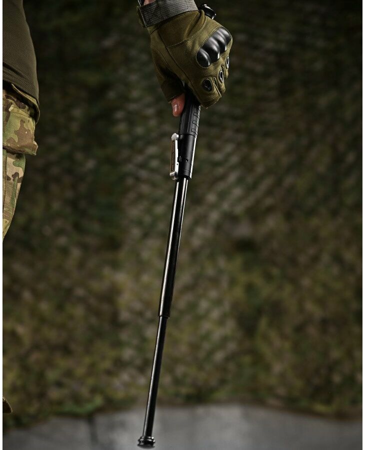 Металлическая телескопическая автоматически раскладная длиной 52 см. в разложенном состоянии. В сложенном состоянии длина 23.5 см. Диамтр ручки 26 мм. Обладает эргономичной структурой ручки, удобна в использовании. Изготовлена из сверхпрочной стали. Имеет три секции. В нижней части рукоятки размещена стеклобой с отверстием для крепления шнурка для крепления на руке. Ручка черного цвета - прорезиненная с изображения ромбиков. Имеет затвор кнопку Пуск - открытие закрытия (фиксации) дубинки, и предохранитель от автоматически самовильный открывания. Для транспортировки на поясе или на другой обмундировке у нас есть тканевая сумка с липучкой. Размещение на обмундировании универсально. Для транспортировки у нас есть пластиковый контейнер 40 мм ˟ 40 мм с возможностью трансформироваться по длине от 220 мм до 370 мм. с возможностью фиксации длины с шагом 3 мм. Вес 536 г., вес в тканевой сумке и в пласиковом фетляре 600 г.