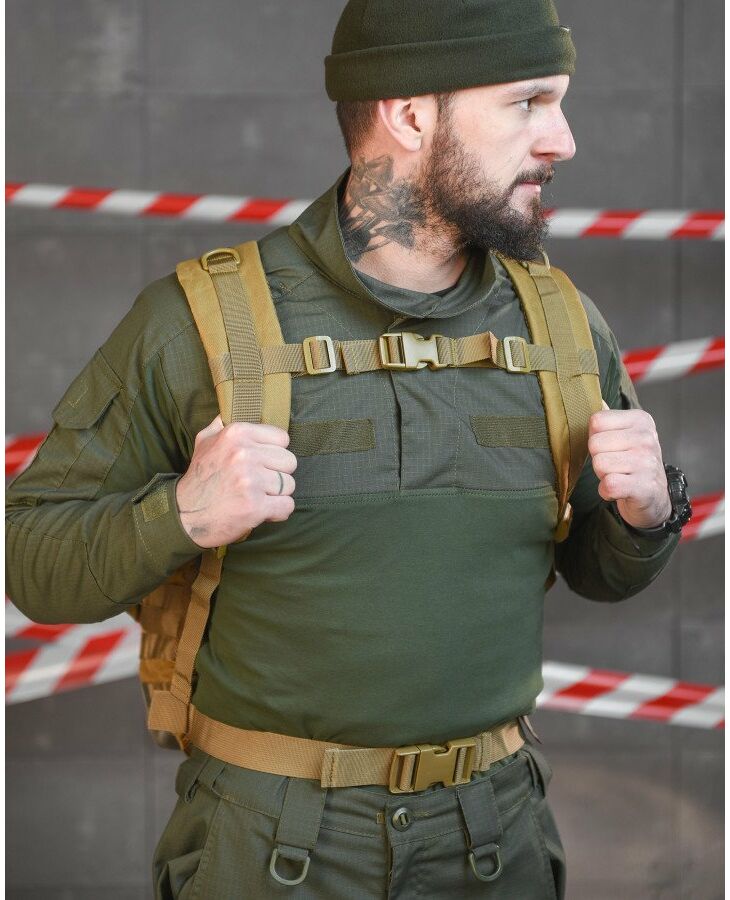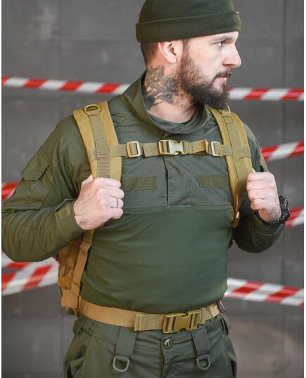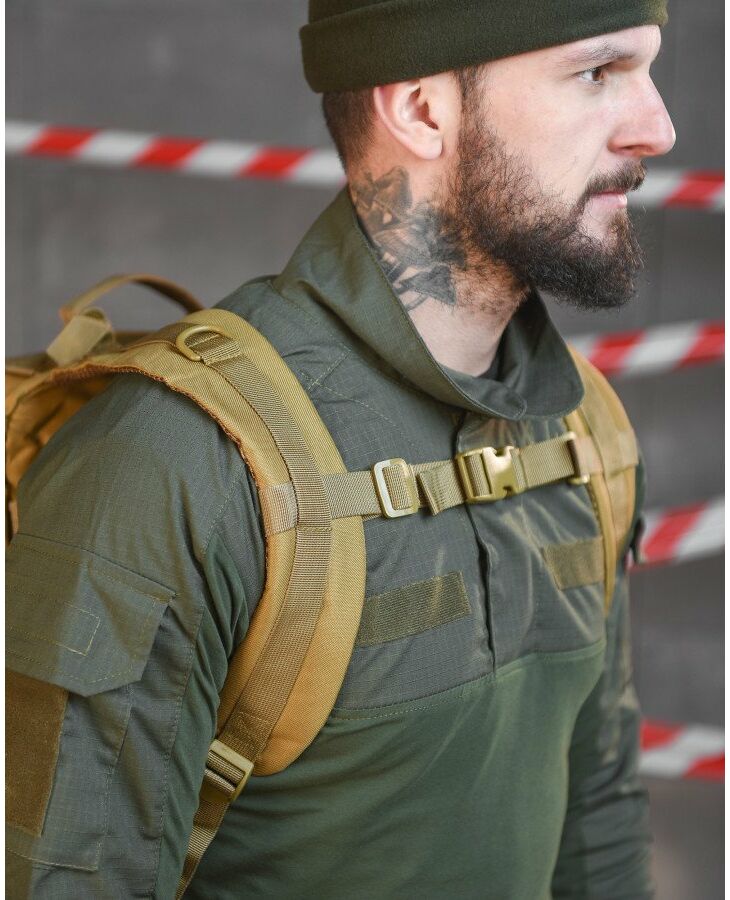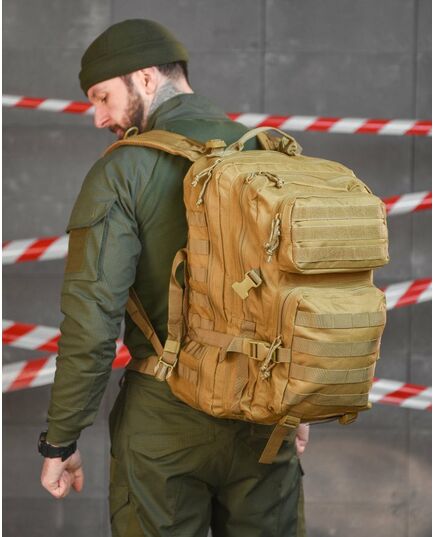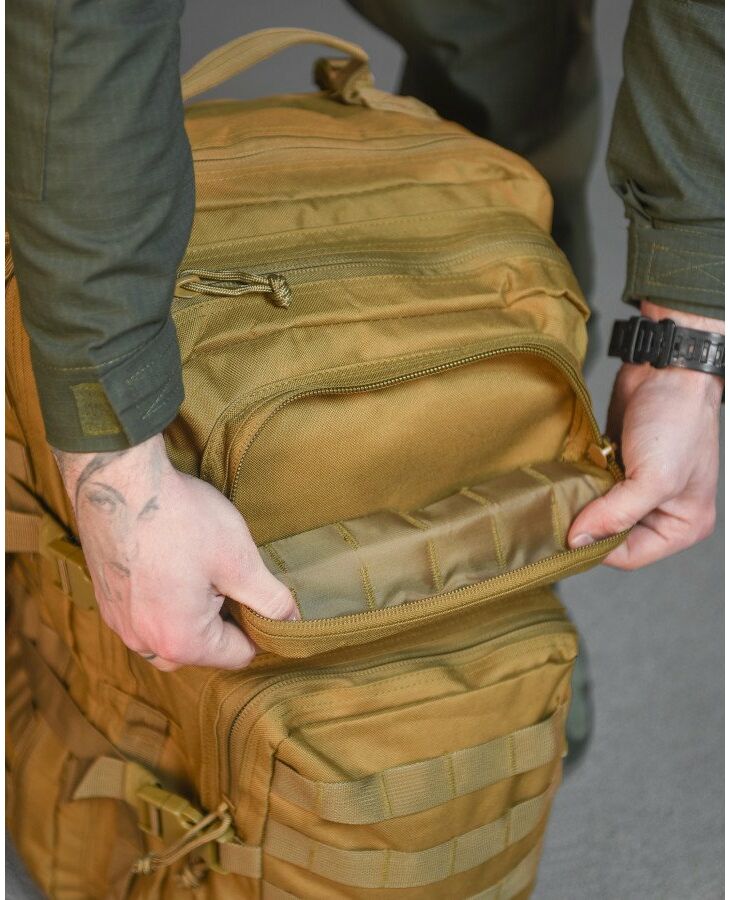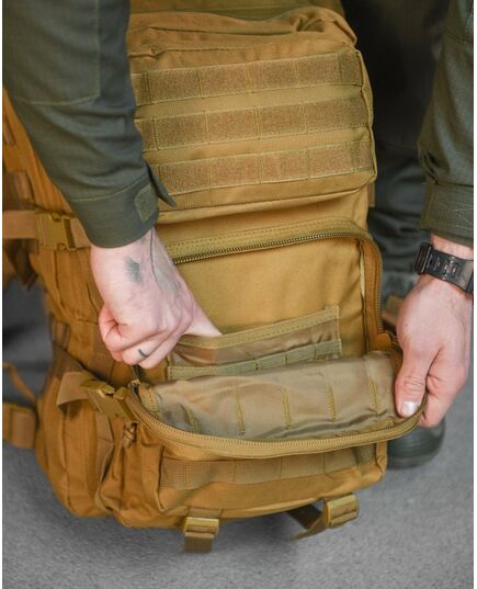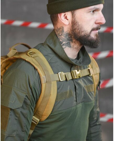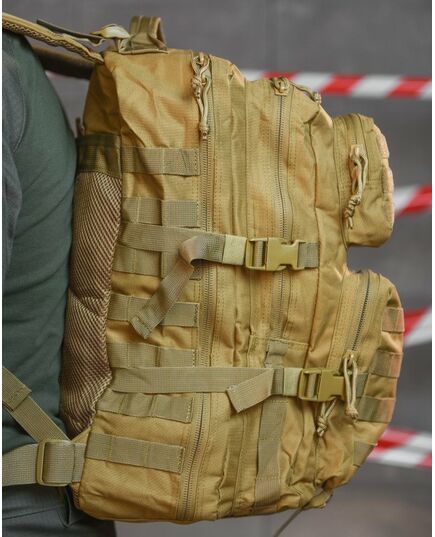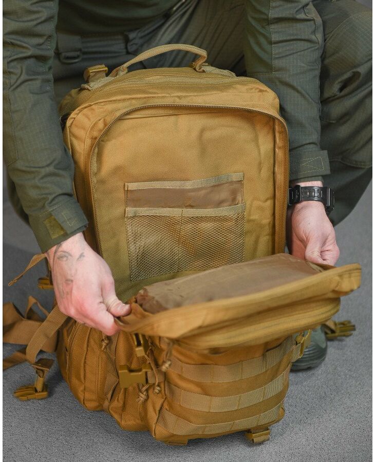 Тактический рюкзак емкостью 36 л. Изготовлен из стойкого полиэстера, дополнительно изнутри покрытого ПВХ покрытием, для защиты от влаги.
