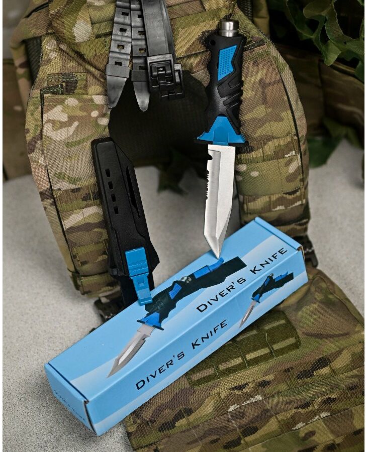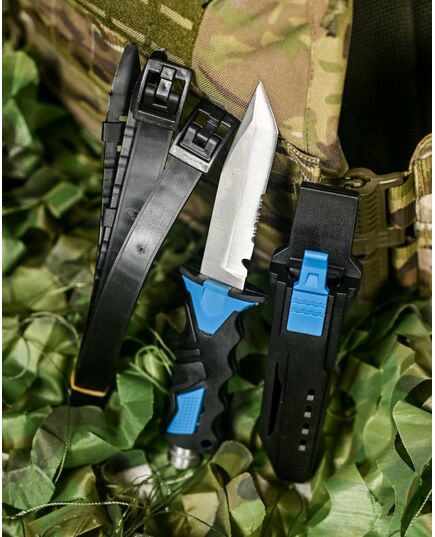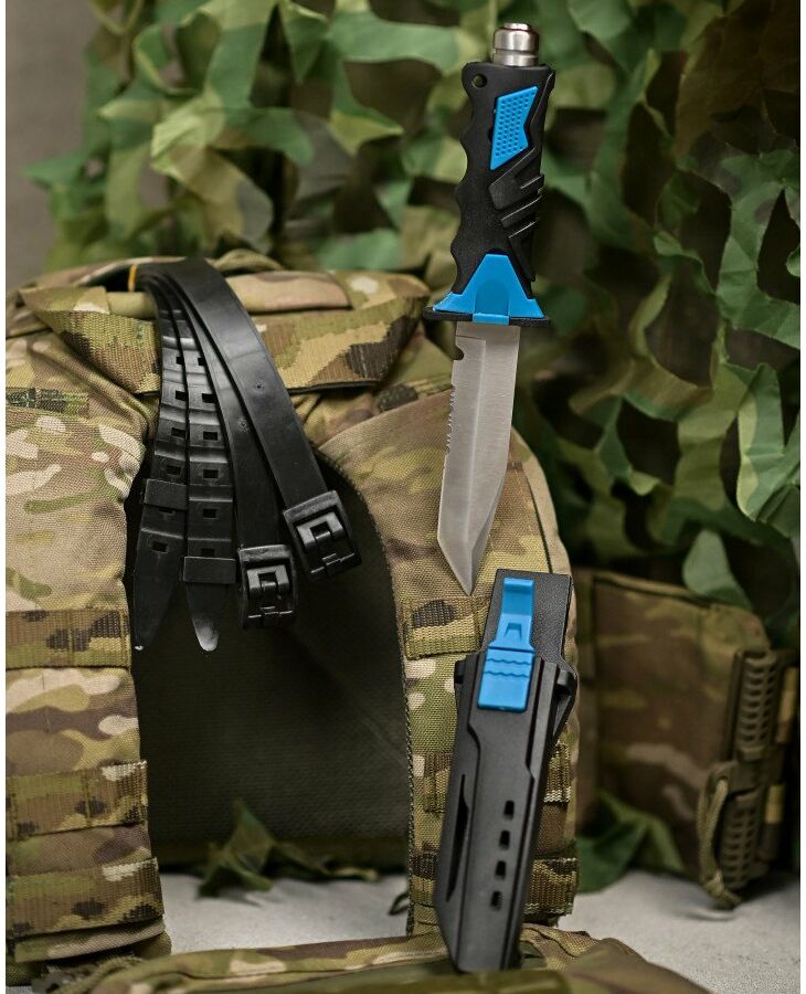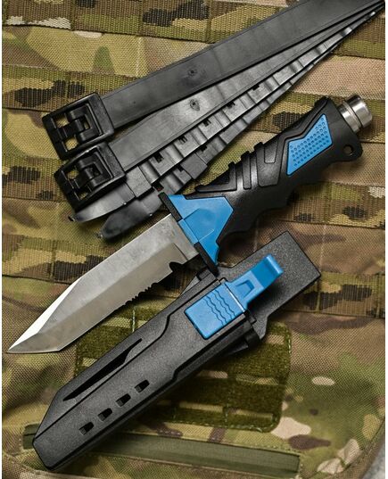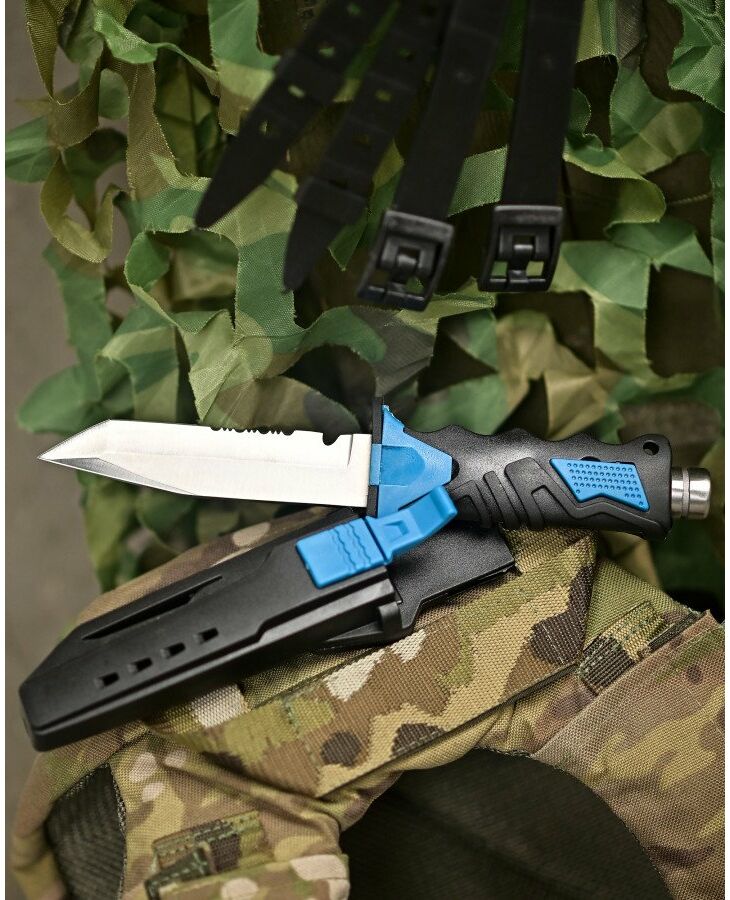 клинок танто, полусеррейтор, стропорез, бита, пластиковый чехол с защелкой фиксатором ножа, 2 резиновых ремня для крепления на ногу. Не является холодным оружием, потому что угол острия (носки) 50 градусов.