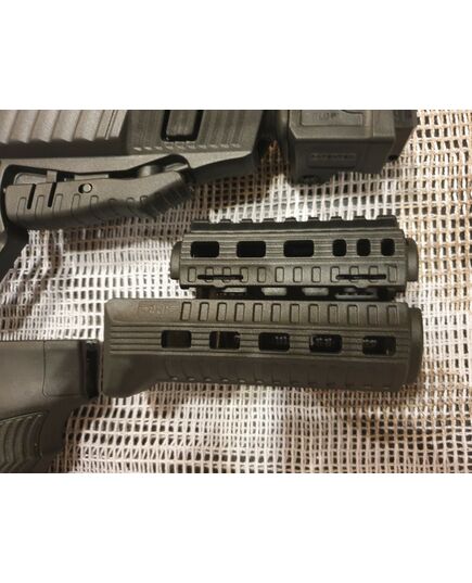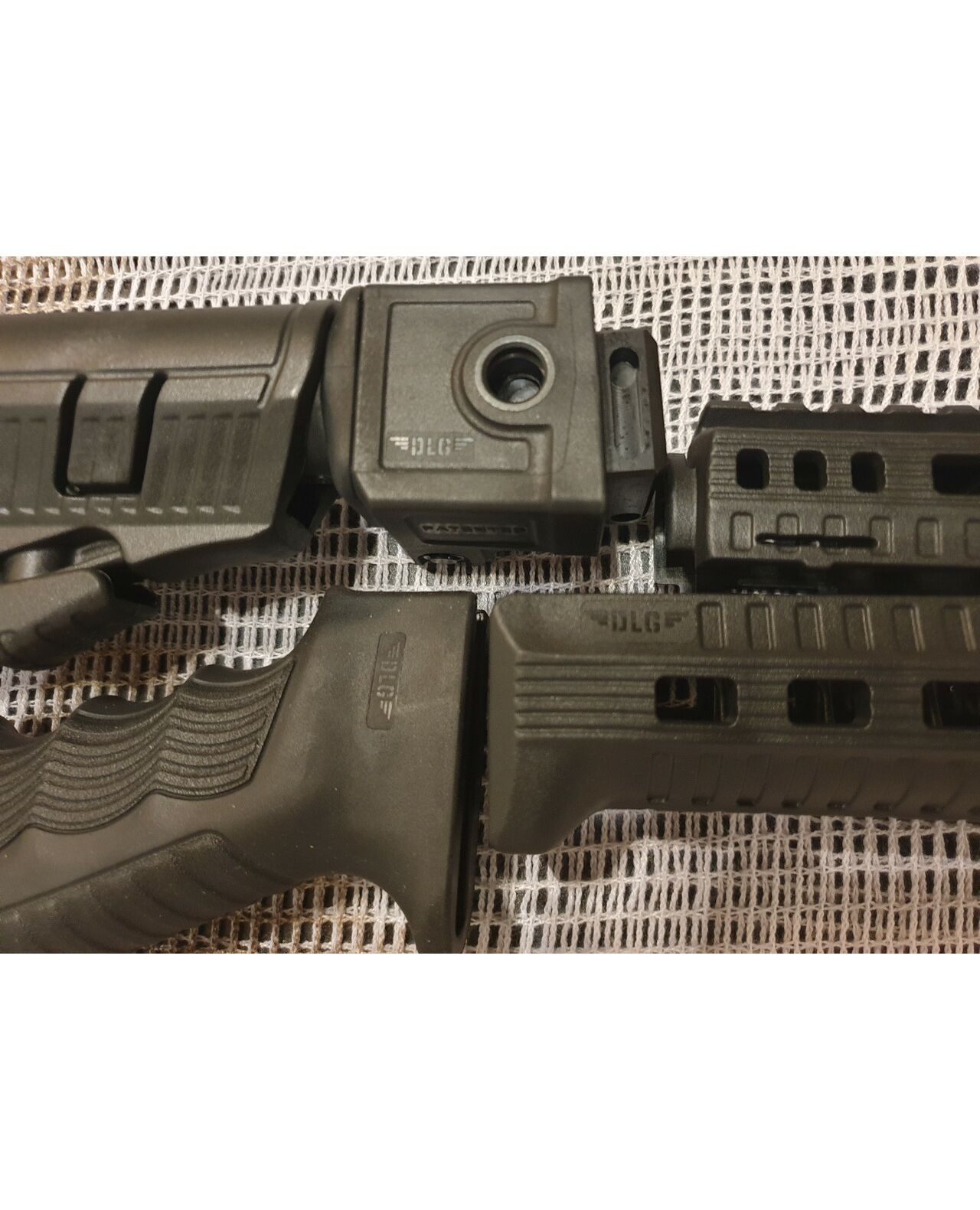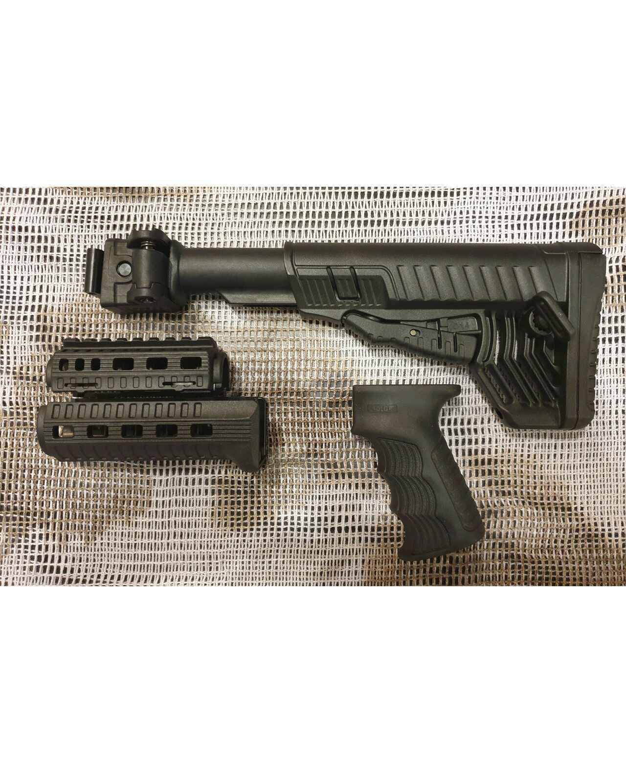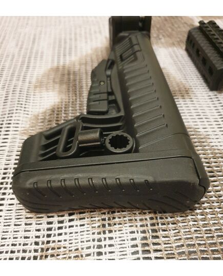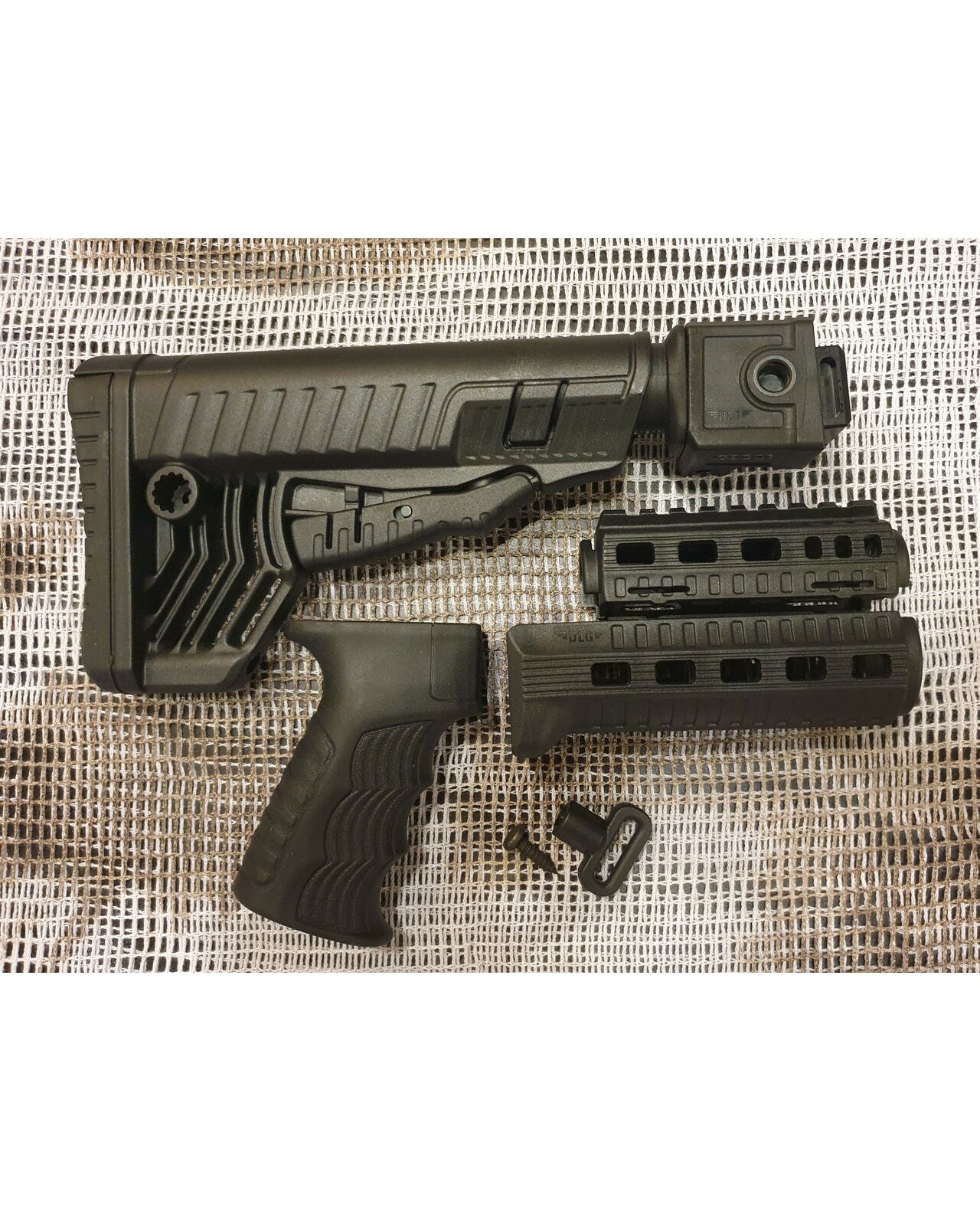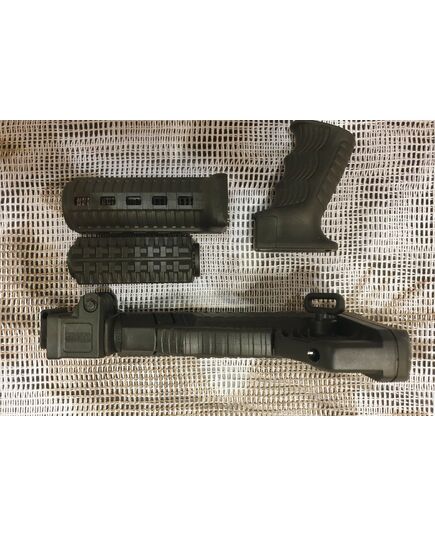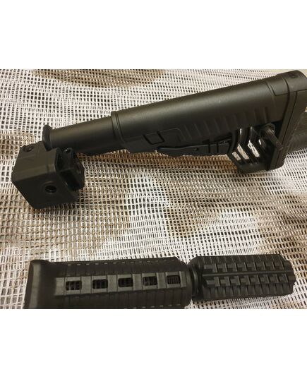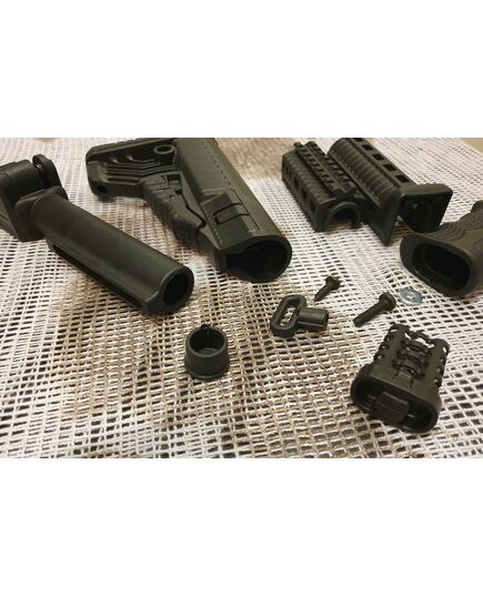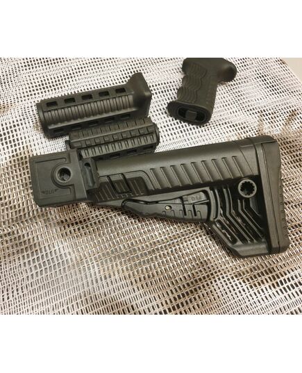 Комплект для апгрейда оружия от официального производителя аксессуаров для стрелкового оружия, фирмы DLG Tactical. Набор состоит из следующих компонентов: цевье; накладка на газовую трубку; прорезининая пистолетная рукоять; быстросъемная антабка; складной в левую сторону телескопический приклад. Доступный в чёрном цвете. Все монтажные саморезы в комплекте. Подходит на АКСУ. Идеальная замена штатного приклада и цевья с накладкой на газовую трубку. На прикладе установлена быстросъемная антабка. Не люфтит, качественный термо пластик. Обвес изготовлен из термостойкого высококачественного армированного полимера. Не люфтит, легко устанавливается.