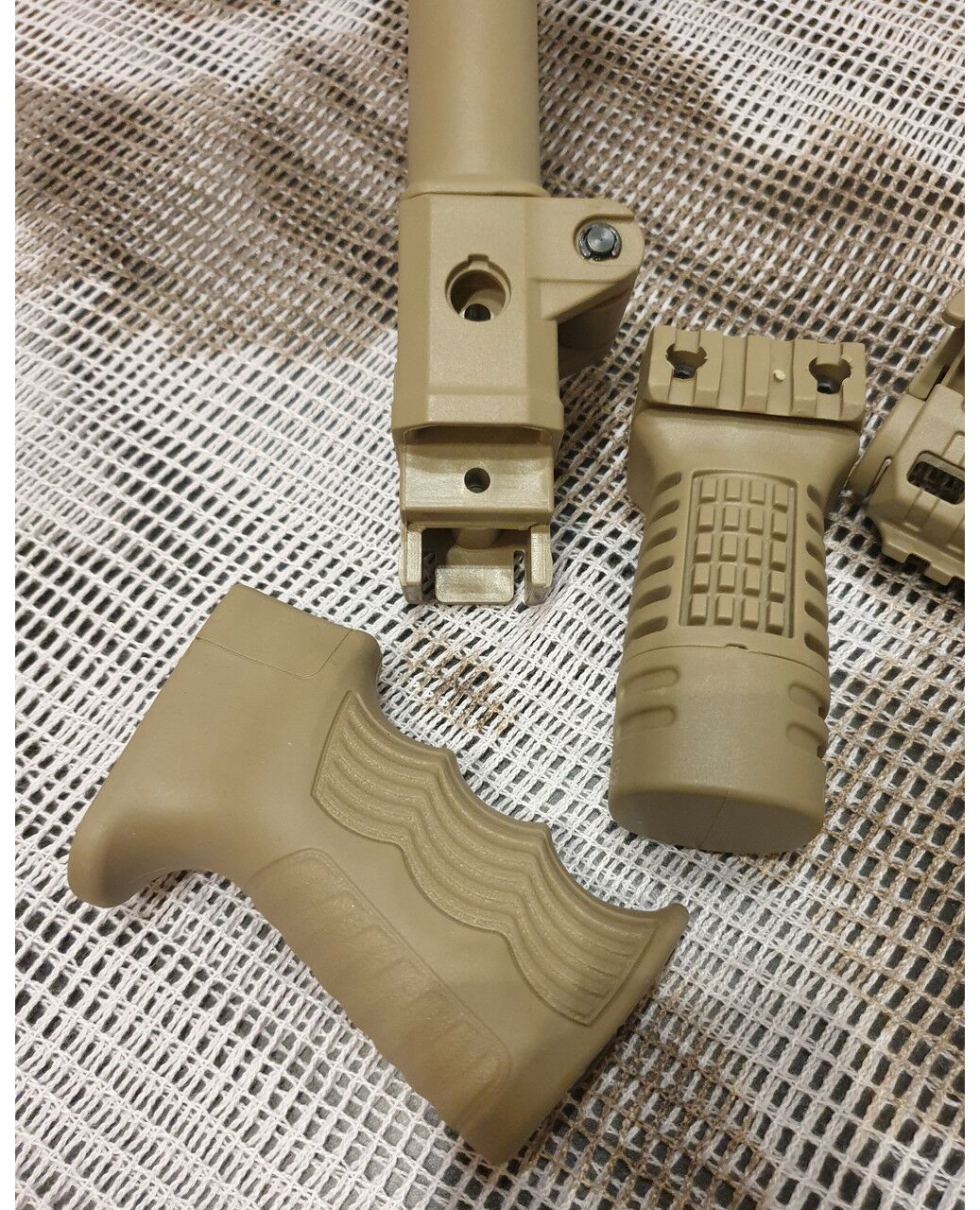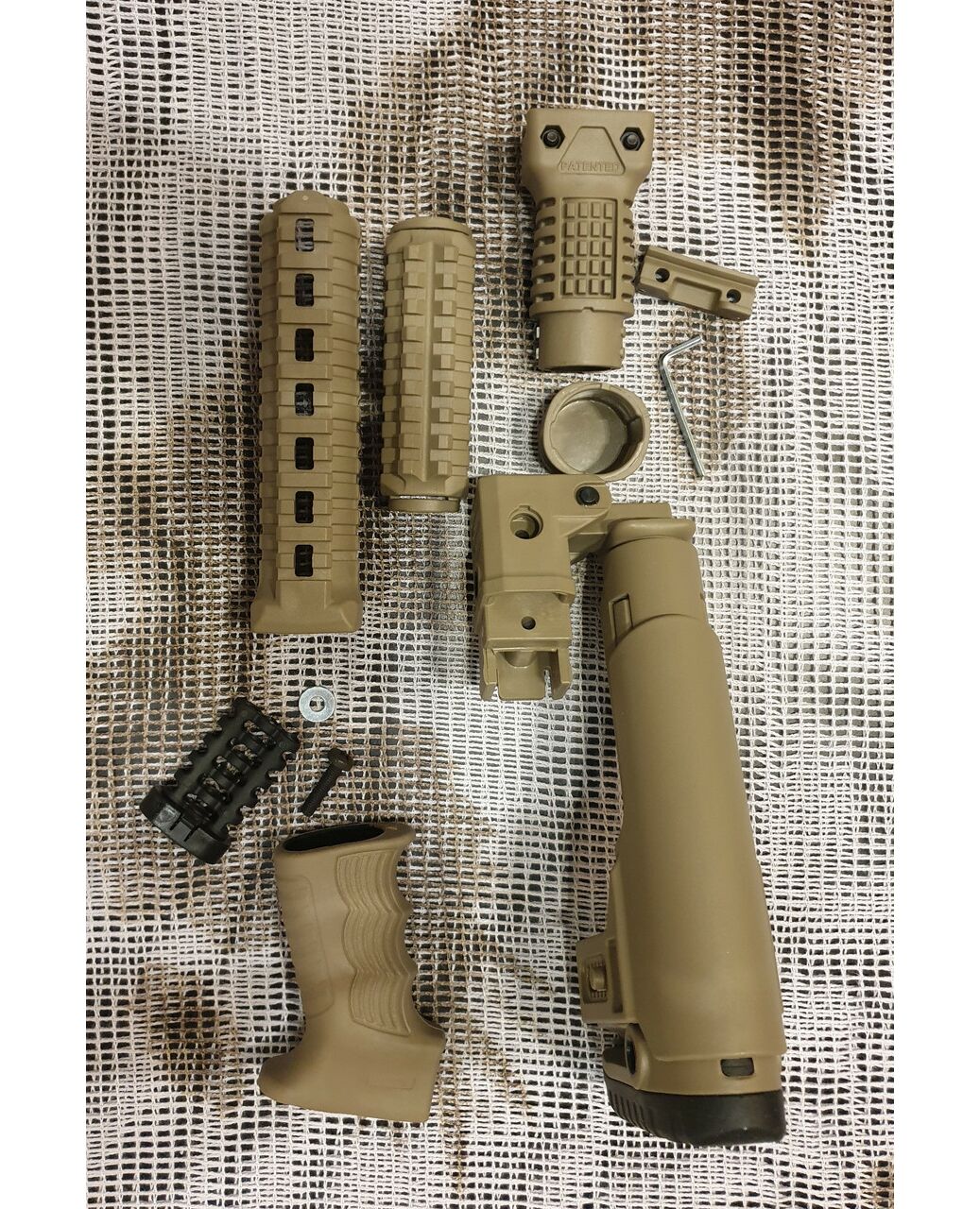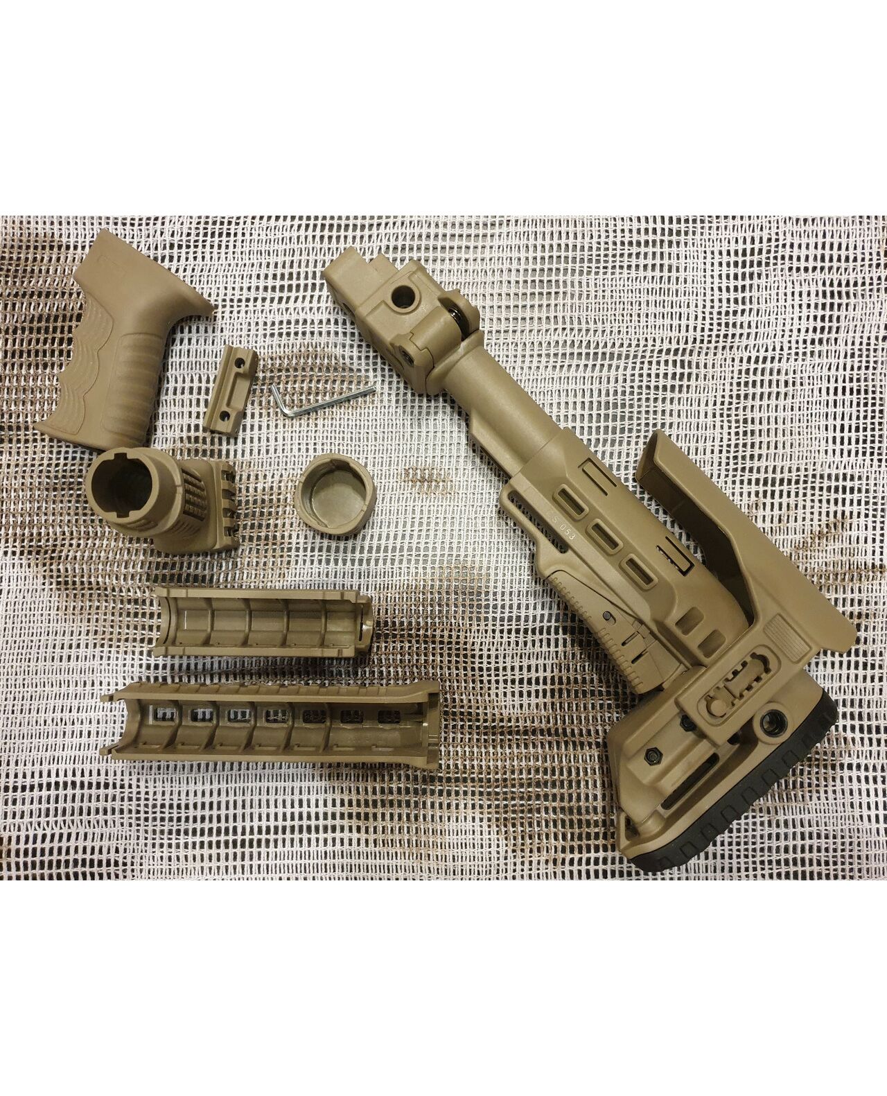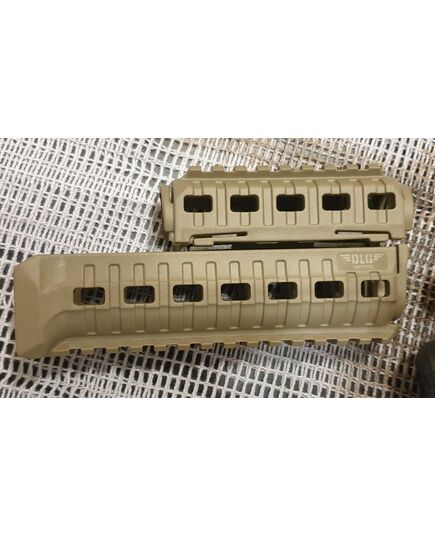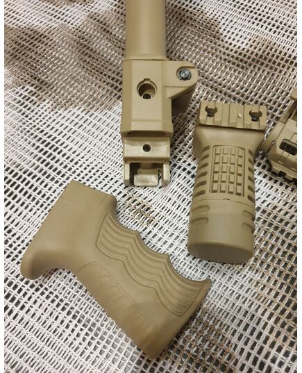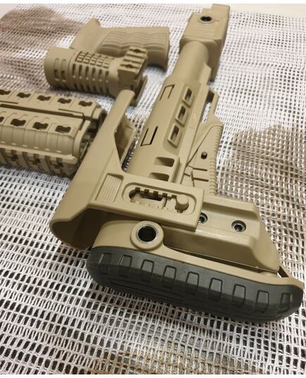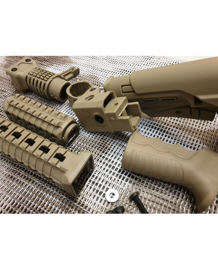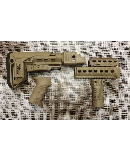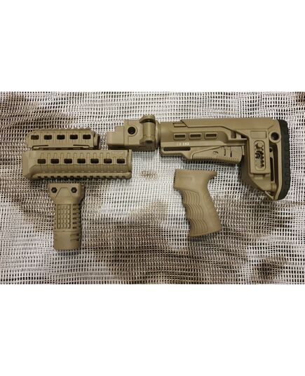 Комплект для апгрейда оружия от официального производителя аксессуаров для стрелкового оружия, фирмы DLG Tactical. Набор состоит из следующих компонентов: цевье; накладка на газовую трубку; прорезиненная пистолетная рукоять; ручка переноски огня и антабка; складной в левую сторону телескопический приклад с регулируемой щекой. Доступный в цвете койот. Все монтажные саморезы в комплекте. Подходит на АК74. Идеальная замена штатного "весла" и цевья с накладкой на газовую трубку. На прикладе установлена быстросъемная антабка. Не люфтит, качественный пластик.Обвес изготовлен из термостойкого высококачественного армированного полимера.