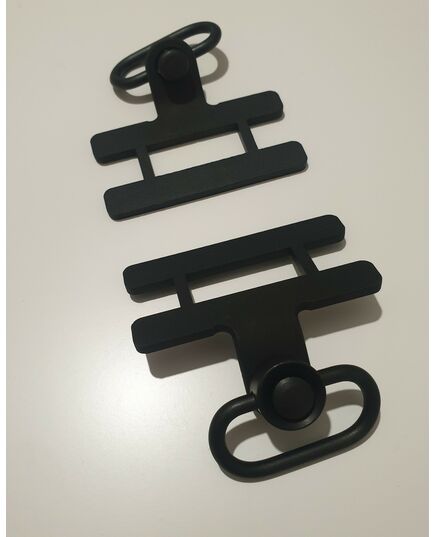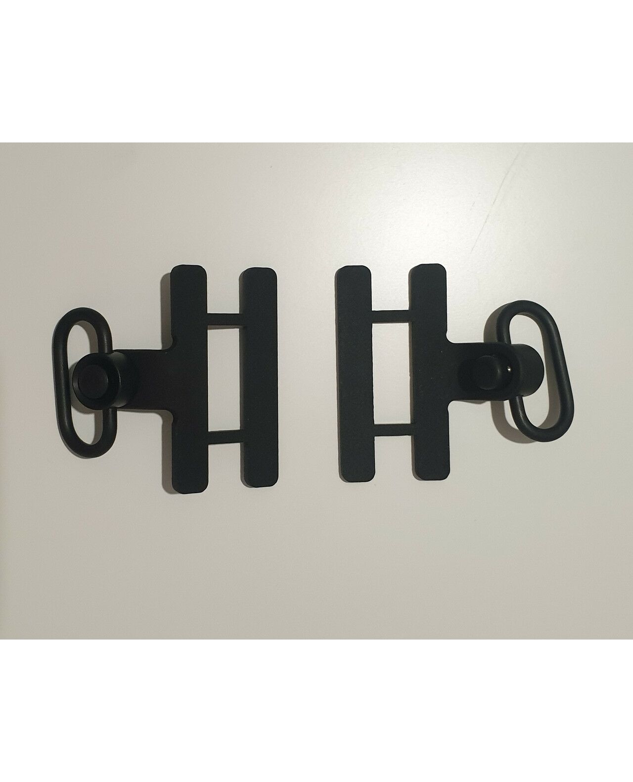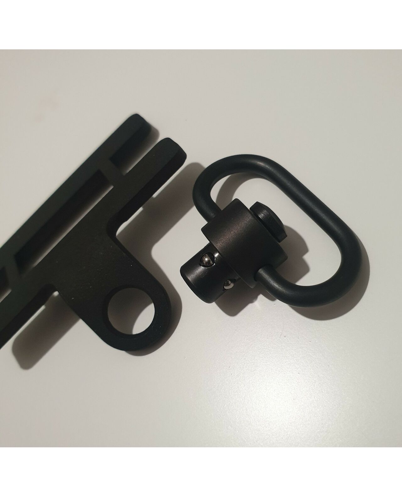 Стальная быстросъемная антабка с базой, устанавливаемая под рукоять автомата калашникова. При установке её можно поставить как на левую, так и на правую сторону автомата (левша, правша). Выполненна из стали 3мм. Очень удобная для быстрого пристегивания и отстегивания ремня от автомата.