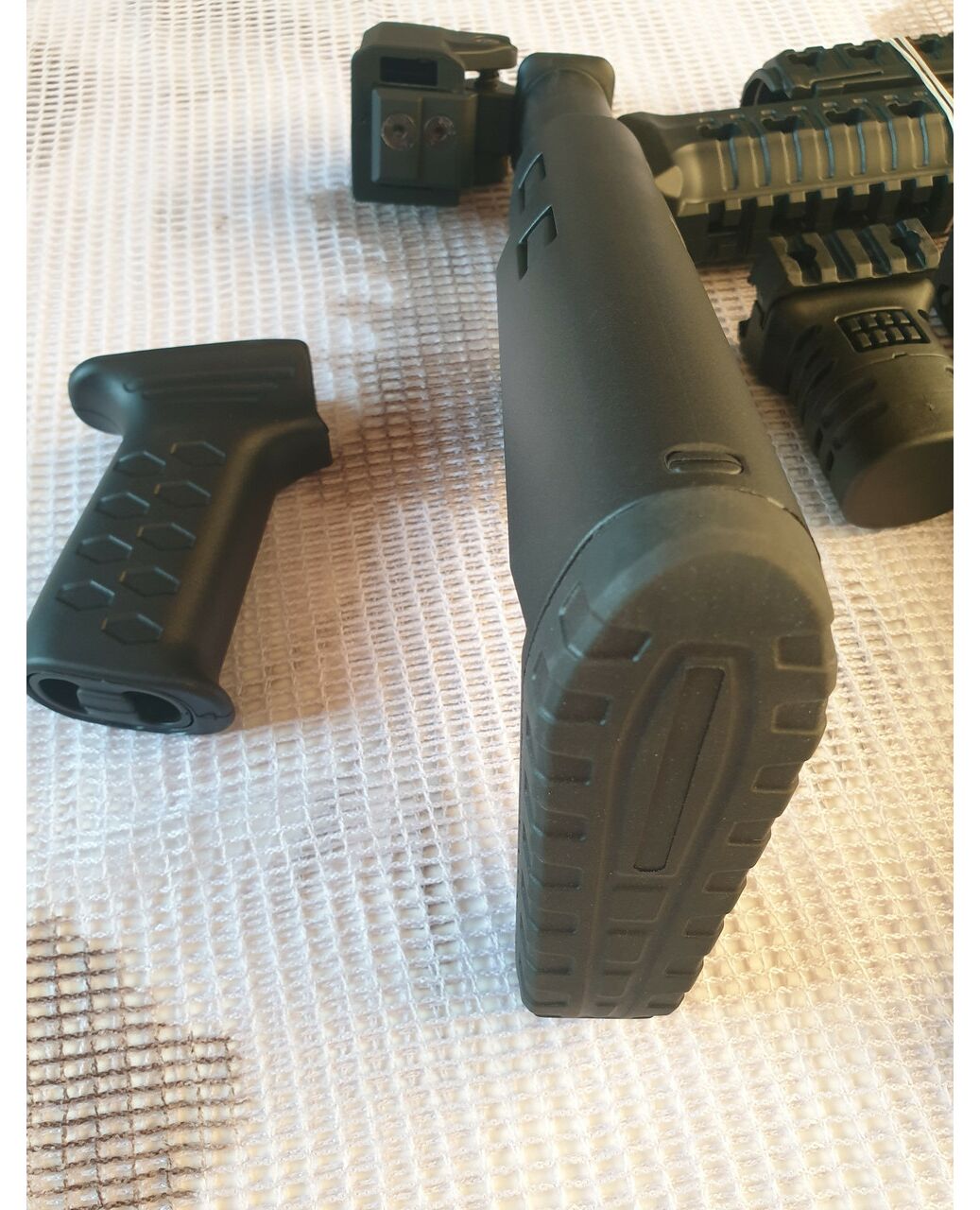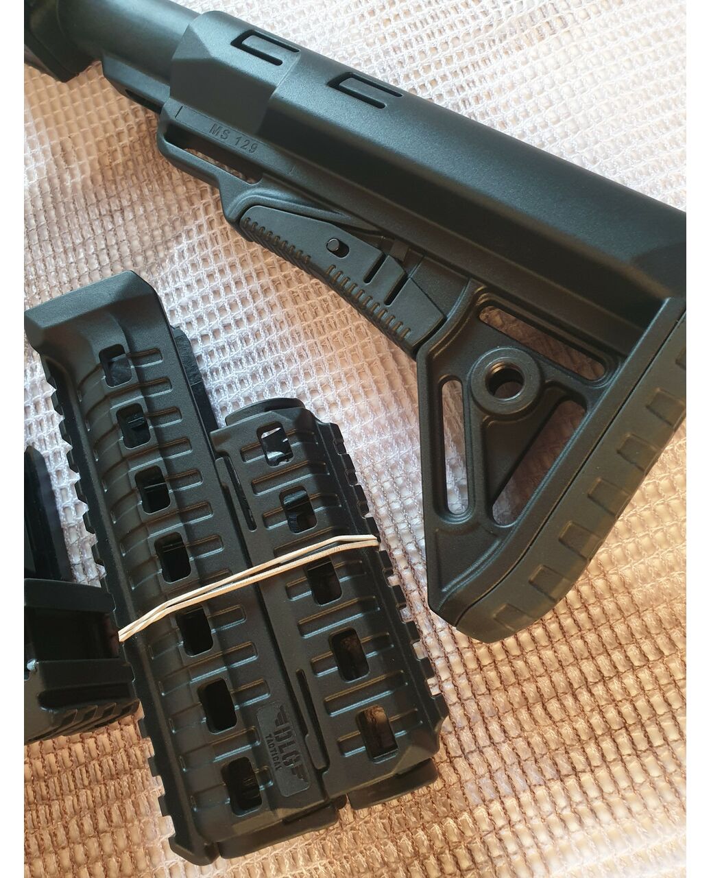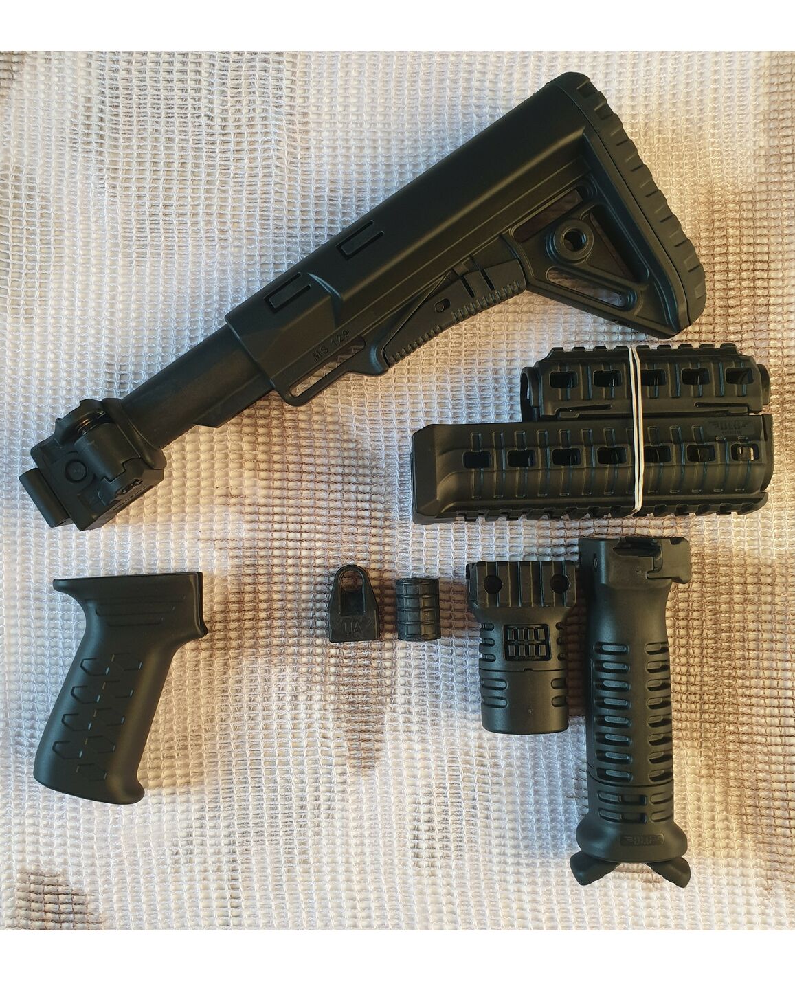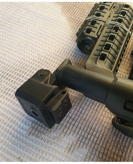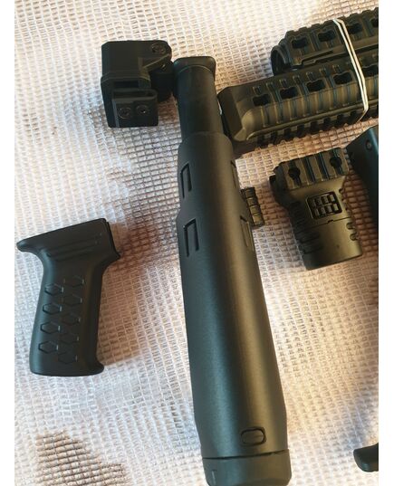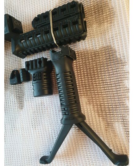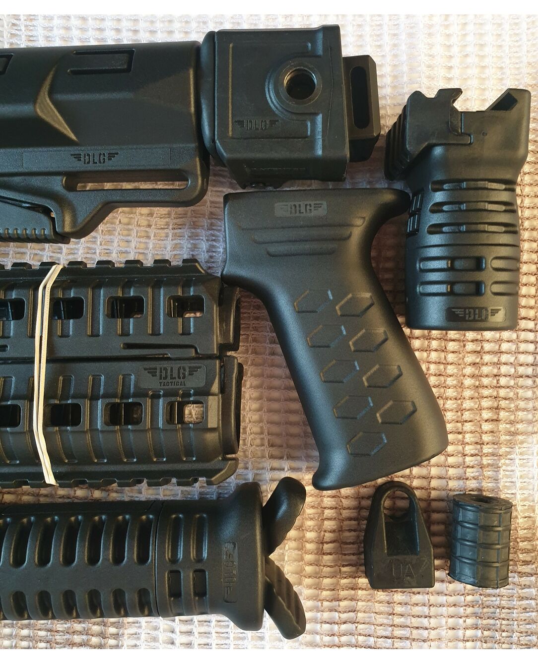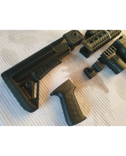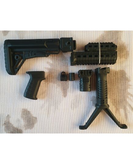 Комплект для апгрейда оружия от официального производителя аксессуаров для стрелкового оружия, фирмы DLG Tactical. Набор состоит из следующих компонентов: скландой телескопический приклад, цевье с планкой пикатини; накладка на газовую трубку; пистолетная рукоять; ручка переноски огня с интегрированными сошками, ручка переноса огня малая, тромикс и буфер отдачи Доступный в чёрном цвете. Все монтажные саморезы в комплекте. Подходит на АКС74 со складным рамочным прикладом в лево. Идеальная замена штатного приклада и цевья с накладкой на газовую трубку. Не люфтит, качественный пластик.Обвес изготовлен из термостойкого высококачественного армированного полимера.