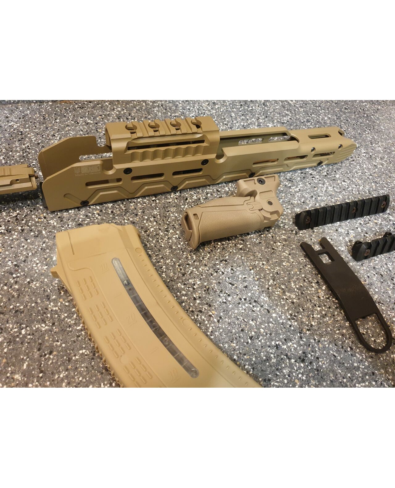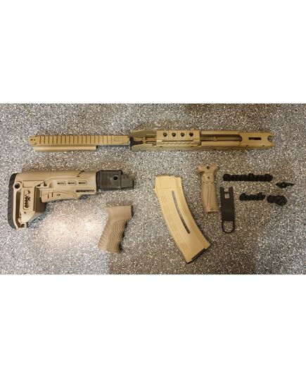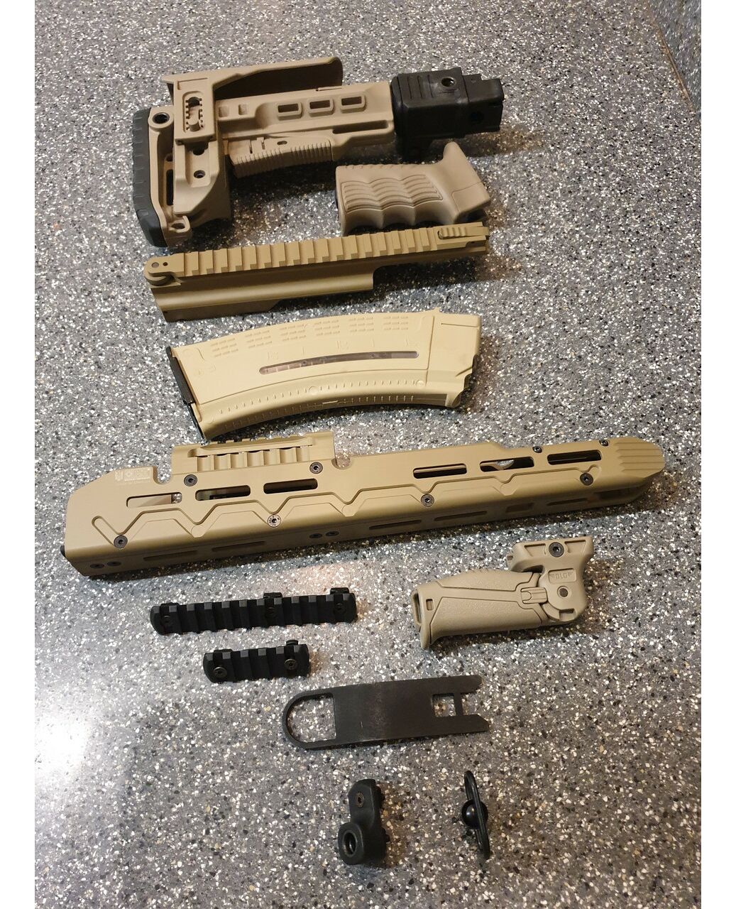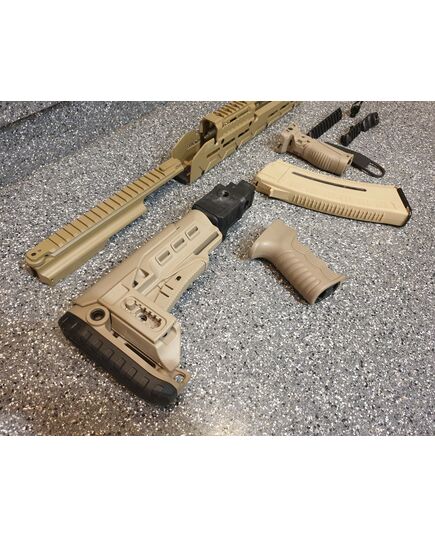 Полный комплект для тюнинга Ак74/АКМ включает в себя : 1) Высококачественное длинное алюминиевое цевье окрашеное оружейной краской Cerokote. 2) Складной телескопический приклад с регулируемой щекой из высококачественного полимера с быстросъемной антабкой. 3) Полимерную складную рукоять переноса огня. 4) Пистолетную прорезиненую рукоять. 5) Крышку ствольной коробки с планкой Пикатини, быстросъёмную окрашеную оружейной краской Cerokote. 6) Буфер отдачи. 7) Тромикс. 8) Планку пикатини для установки ручки переноса огня. 5 слотов. 9) Планку пикатини для установки дополнительных аксессуаров типо фонарика. 13 слотов. 10) Стальную антабку под рукоять для одноточечного ремня. 11) гнездо QD для M Lok. 12) магазин сертифицированный с прозрачным окном на 30 патронов 5.45х39. В цвет комплекта. Цевьё представляет из себя: Жёсткую алюминевую конструкцию. - Длина 360 мм. - Полный вес 420 грамм. - Интерфейс M-Lok для крепления аксессуаров- Установка на штатные посадочные места, поэтому ничего пилить не придется. - Возможно использовать как с родной газовой трубкой, так и с трубками других производителей. -В комплект входят и верхняя и нижняя части цевья. Нижнюю часть можно использовать по отдельности. Совместимость:- AКМ- АК-74 Цвет Койот. Комплект для апгрейда оружия для стрелкового оружия, фирмы Tactical + МЕ. Набор состоит из следующих компонентов: пистолетная рукоять прорезиненная, регулируемый складной телескопический приклад с регулируемойщекой, ручка переноса огня складная, стальная антабка с выносом назад, буфер отдачи, тромикс, 2шт планки пикатини с m lok, гнездо QD для быстросъемной антабки, магазин на 30 патронов 5.45 Х39 в цвет комплекта и длинное легкое алюминиевое цевье . Доступный в цвете койот. Все монтажные саморезы в комплекте. Подходит на АК74/АКМ. Идеальная замена штатного "весла" и цевья с накладкой на газовую трубку. Продукция изготовлена из термостойкого высококачественного армированного полимера и авиационного алюминия.
