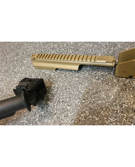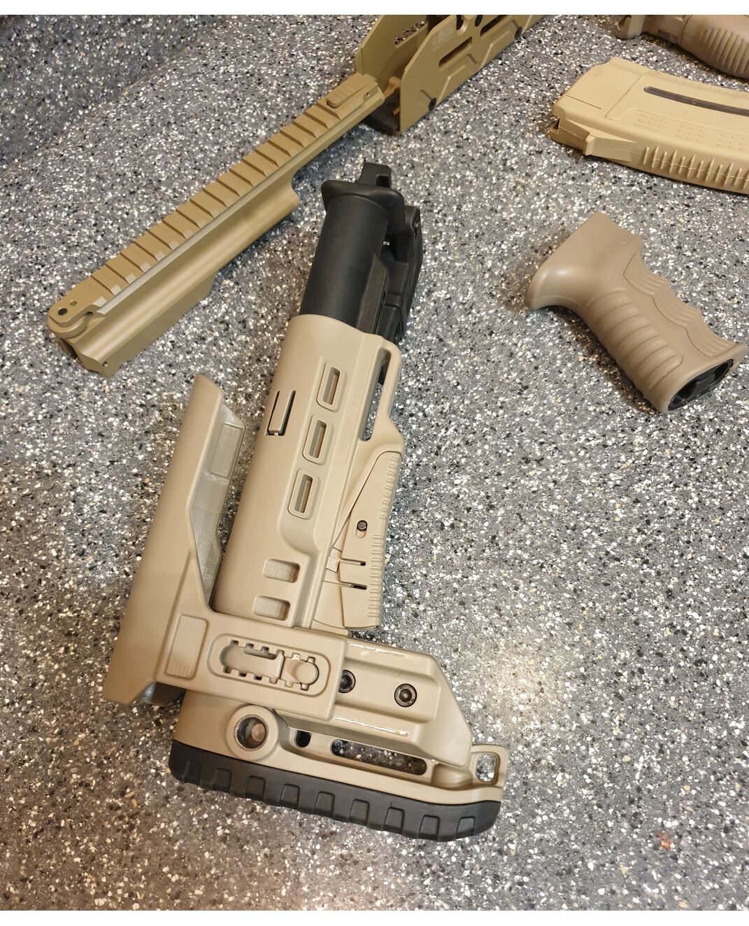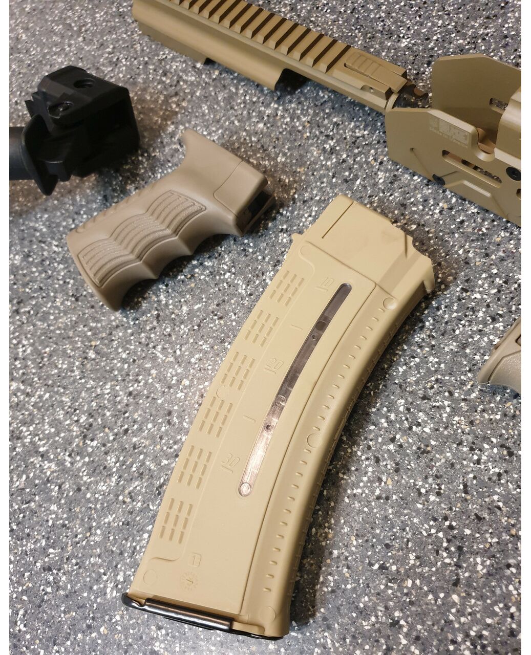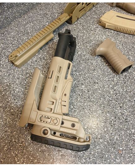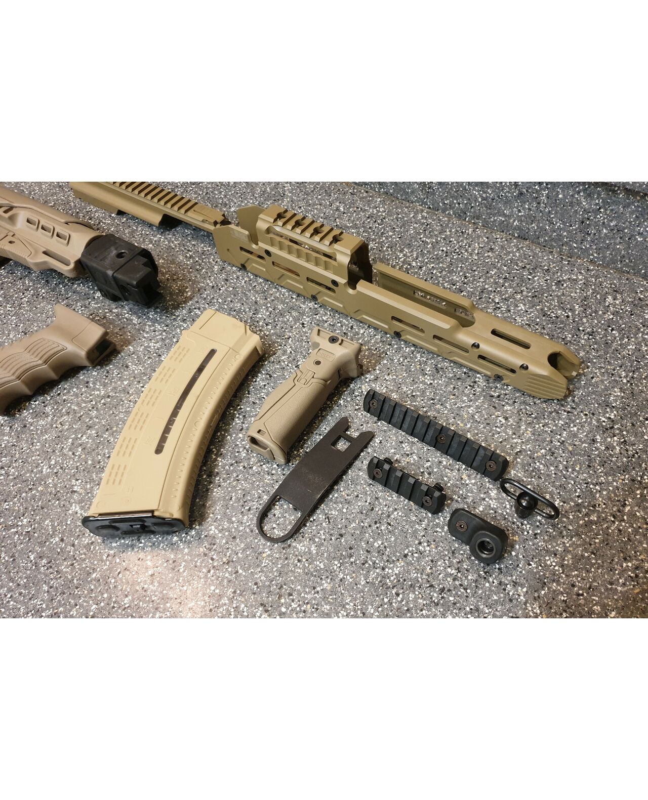 Полный комплект для тюнинга Ак74/АКМ включает в себя : 1) Высококачественное длинное алюминиевое цевье окрашеное оружейной краской Cerokote. 2) Складной телескопический приклад с регулируемой щекой из высококачественного полимера с быстросъемной антабкой. 3) Полимерную складную рукоять переноса огня. 4) Пистолетную прорезиненую рукоять. 5) Крышку ствольной коробки с планкой Пикатини, быстросъёмную окрашеную оружейной краской Cerokote. 6) Буфер отдачи. 7) Тромикс. 8) Планку пикатини для установки ручки переноса огня. 5 слотов. 9) Планку пикатини для установки дополнительных аксессуаров типо фонарика. 13 слотов. 10) Стальную антабку под рукоять для одноточечного ремня. 11) гнездо QD для M Lok. 12) магазин сертифицированный с прозрачным окном на 30 патронов 5.45х39. В цвет комплекта. Цевьё представляет из себя: Жёсткую алюминевую конструкцию. - Длина 360 мм. - Полный вес 420 грамм. - Интерфейс M-Lok для крепления аксессуаров- Установка на штатные посадочные места, поэтому ничего пилить не придется. - Возможно использовать как с родной газовой трубкой, так и с трубками других производителей. -В комплект входят и верхняя и нижняя части цевья. Нижнюю часть можно использовать по отдельности. Совместимость:- AКМ- АК-74 Цвет Койот. Комплект для апгрейда оружия для стрелкового оружия, фирмы Tactical + МЕ. Набор состоит из следующих компонентов: пистолетная рукоять прорезиненная, регулируемый складной телескопический приклад с регулируемойщекой, ручка переноса огня складная, стальная антабка с выносом назад, буфер отдачи, тромикс, 2шт планки пикатини с m lok, гнездо QD для быстросъемной антабки, магазин на 30 патронов 5.45 Х39 в цвет комплекта и длинное легкое алюминиевое цевье . Доступный в цвете койот. Все монтажные саморезы в комплекте. Подходит на АК74/АКМ. Идеальная замена штатного "весла" и цевья с накладкой на газовую трубку. Продукция изготовлена из термостойкого высококачественного армированного полимера и авиационного алюминия.