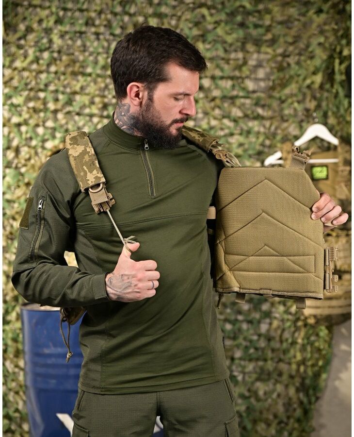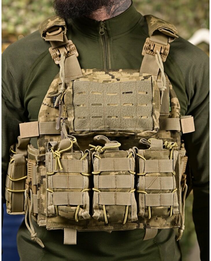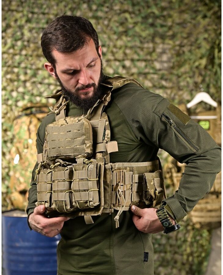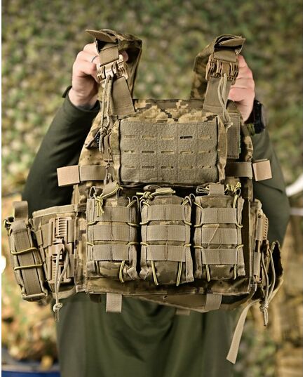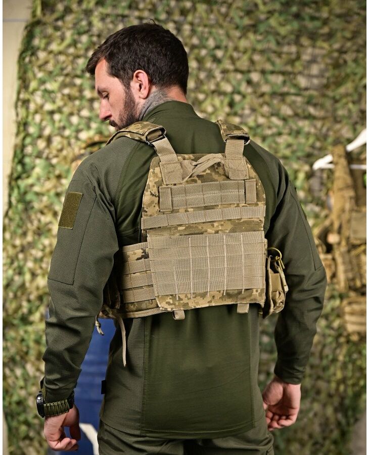 Изготовлен из прочной водонепроницаемой ткани нейлон Cordura и оборудован модульной системой съемных подсумков. Свободно регулируется по высоте и объему. Верх – регулируется ремнями, низ – качественной, крепко прошитой липучкой класса "А". Также есть быстрый сброс бронежилета от снаряжения для оказания помощи бойцу. Изготовлена плитоноска из плотной кордуры 1000D, которая устойчива от разрывов и истирания. Изнутри есть вставки из 3D сетки, задача которых обеспечить необходимую терморегуляцию тела при длительном ношении и интенсивном движении.