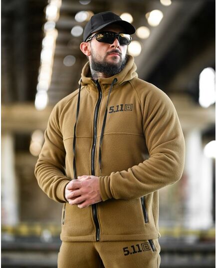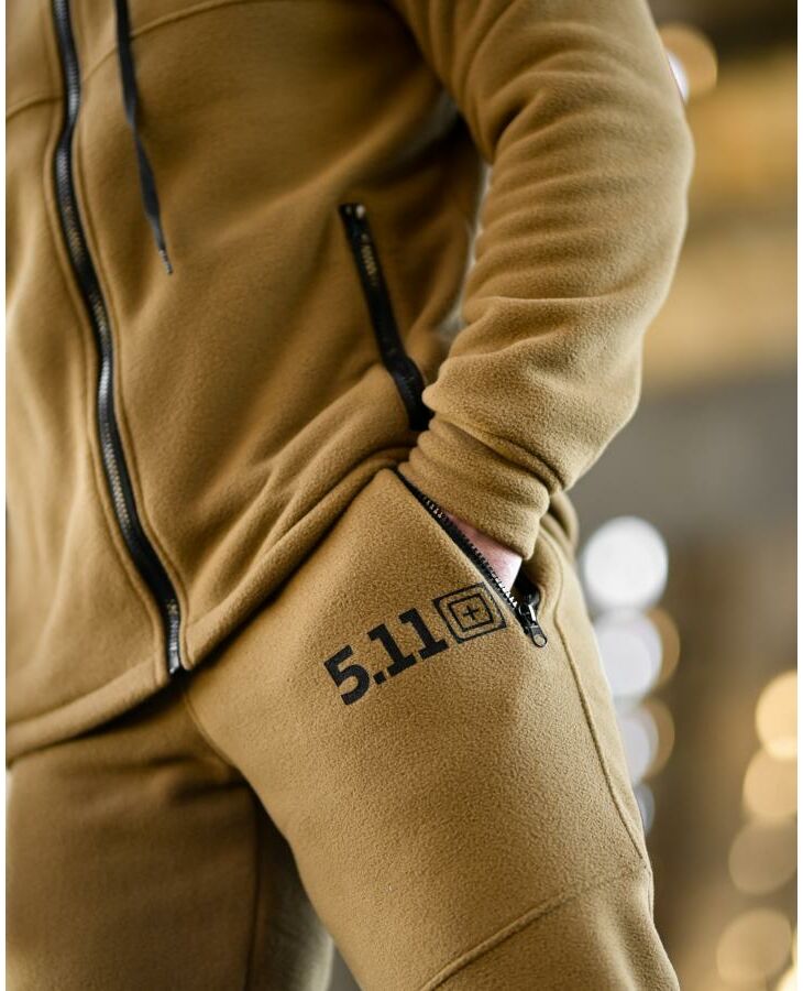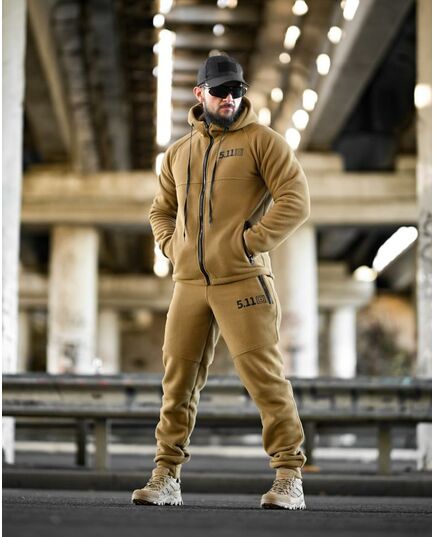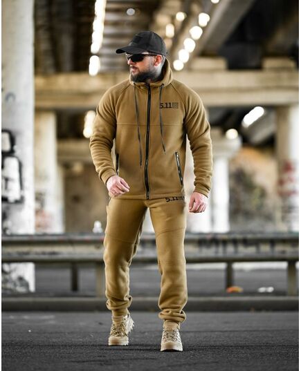 Костюм состоит из худи на молнии и брюк с манжетами.