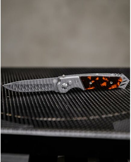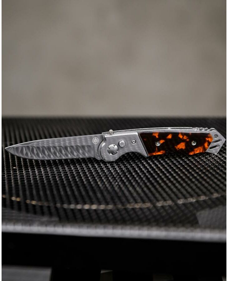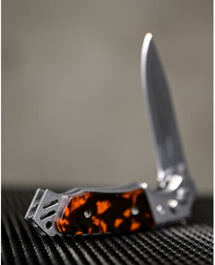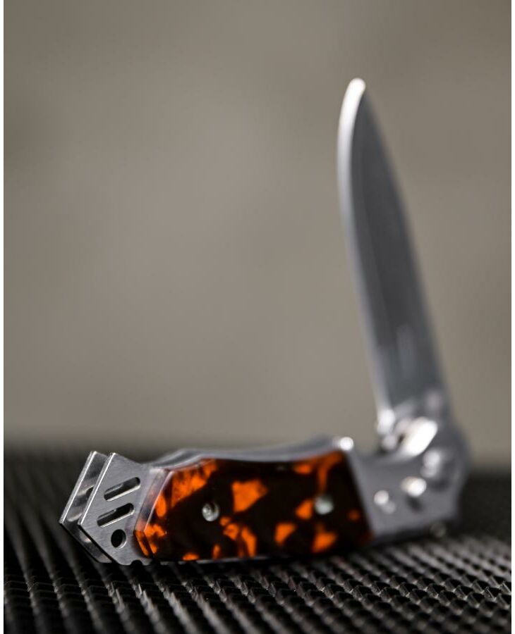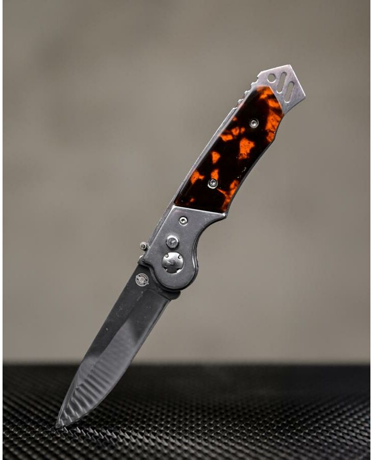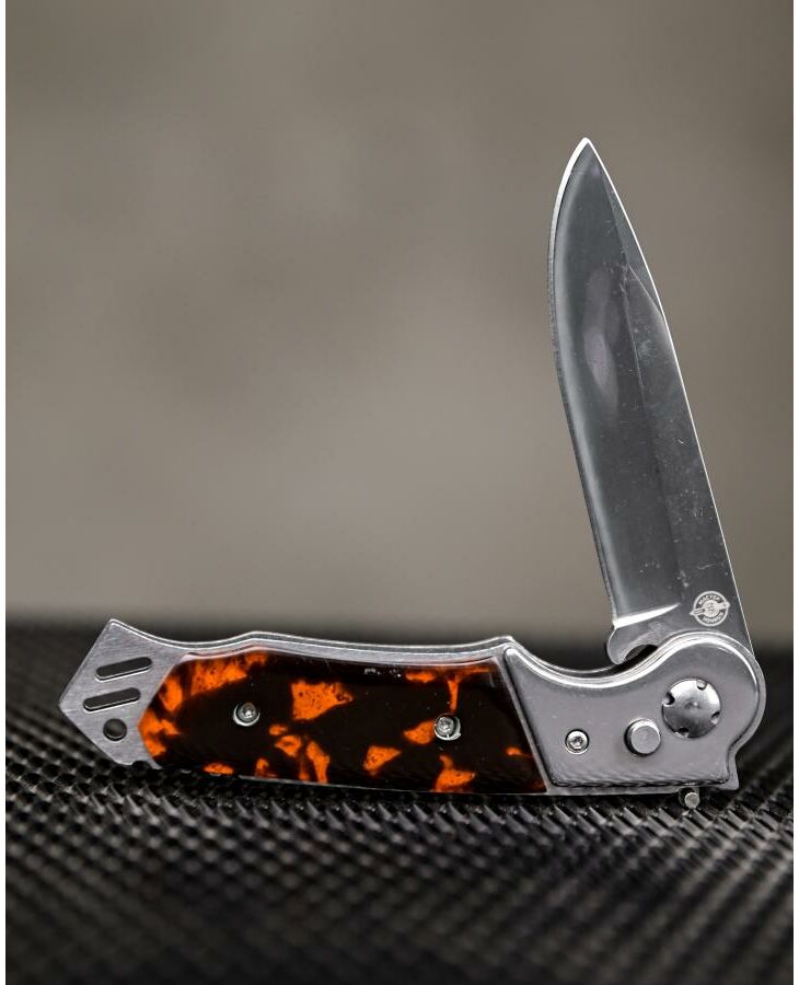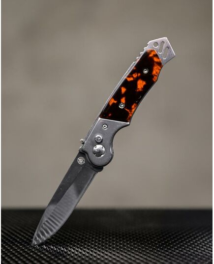 Это автоматический нож с боковым извлечением. Клинок выполнен из нержавеющей стали, легко точится, обладает высокой сопротивляемостью коррозии. Рукоять прочная, с пластиковыми накладками. Она имеет анатомически выгодную форму с глубокой выемкой под указательный палец. Стальные лайнеры образуют навершие, которое можно использовать в качестве стеклобоя. Для еще большей надежности Мираж снабжен предохранителем. Вес ножа составляет 120 граммов, он совершенно не отягощает ни в городе, ни в походе. В комплект входит удобный чехол.