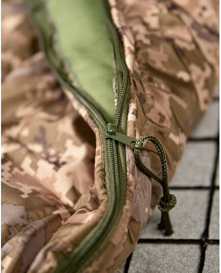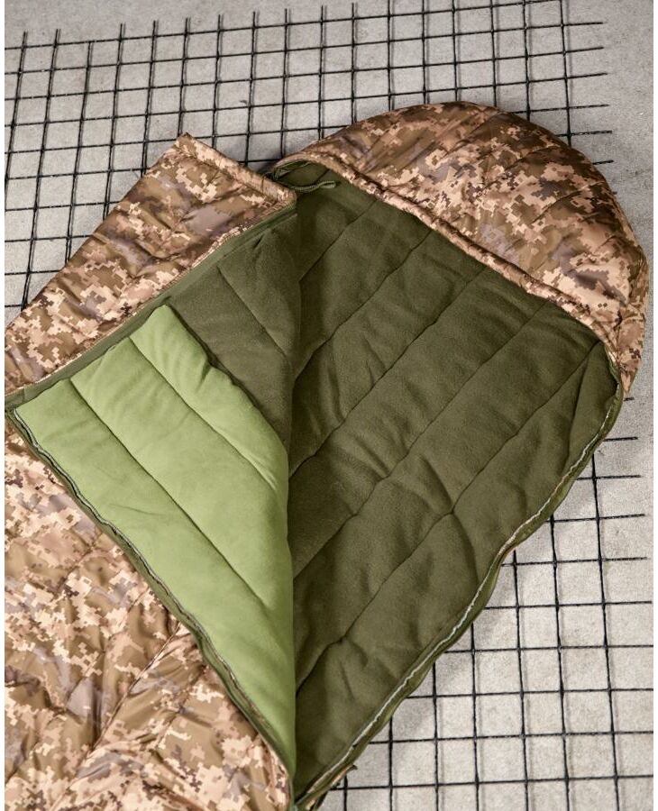 Зимний тактический спальный мешок с капюшоном в цвете олива (украинское производство) адаптирован к экстремальным полевым условиям благодаря внешнему водонепроницаемому слою, который защищает от дождя и ветра. Внутренняя ткань флис, сохранит тепло внутри спального мешка, утеплитель силиконизированный синтепон (при одинаковой толщине в 1,5 раза теплее, чем пух, и примерно в 2 раза теплее, чем другие изоляционные материалы). Спальник подходит для использования в диапазоне температур от -5 до -20 °C, что делает его идеальным выбором для холодных зимних ночей. Конструкция с двусторонней молнией позволяет быстро расстегнуть спальник и вылезти из него или сделать его одеялом. Также благодаря двусторонней змейке можно отдельно расстегнуть снизу змейку, что даст больше пространства для ног. Размер в разложенном 210*75см ( как одеяло 210*150см ), в сложенном виде 50*30см. Вес 1.2 кг