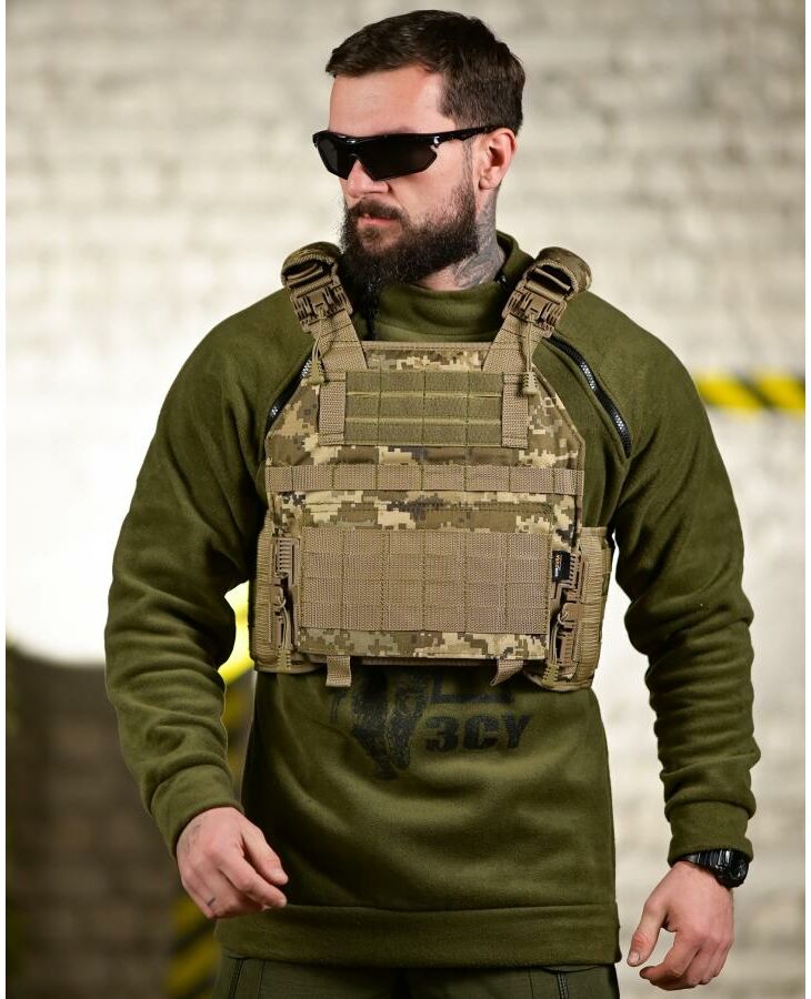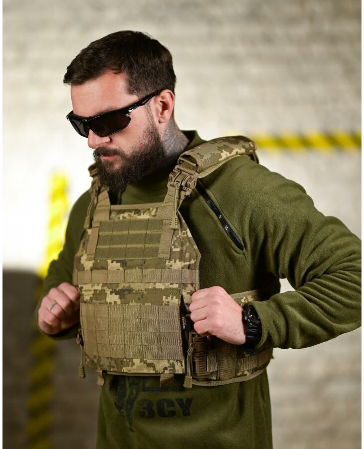 тактическая плитоноска в актуальном камуфляже с усиленными плечевыми лямками, быстросъёмными фастексами и полноформатной MOLLE-сеткой. Модель предназначена для удобного и надёжного размещения бронеплит 250×300 мм, а также дополнительного навесного оборудования.