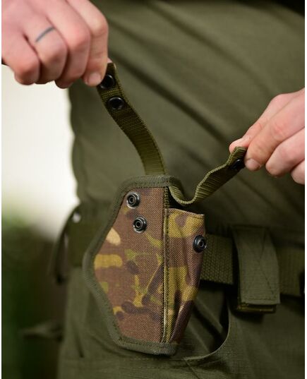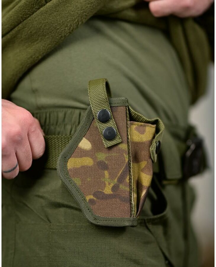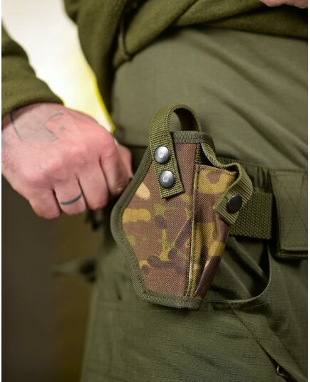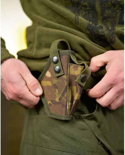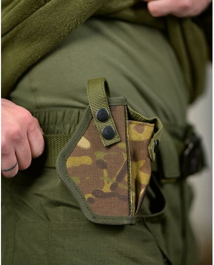 Кобура тактическая поясная на системе закрепляется регулируемым ремешком с кнопкой и липучкой поверх кнопки. Также поясная кобура имеет отделение для запасной обоймы. Тактическая кобура закрепляется на ремне, максимальная ширина которого составляет 6 см