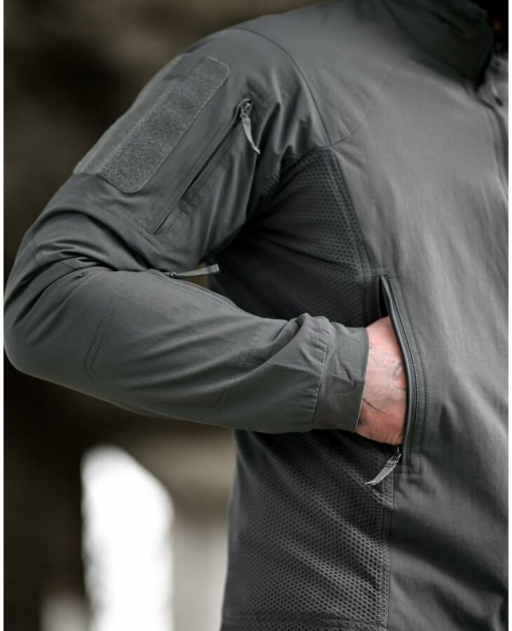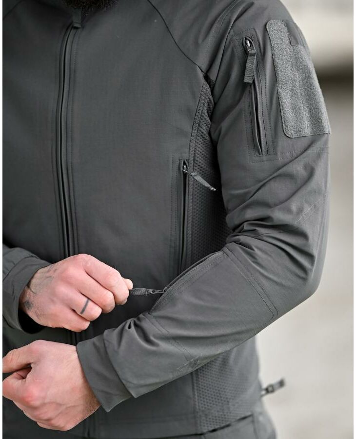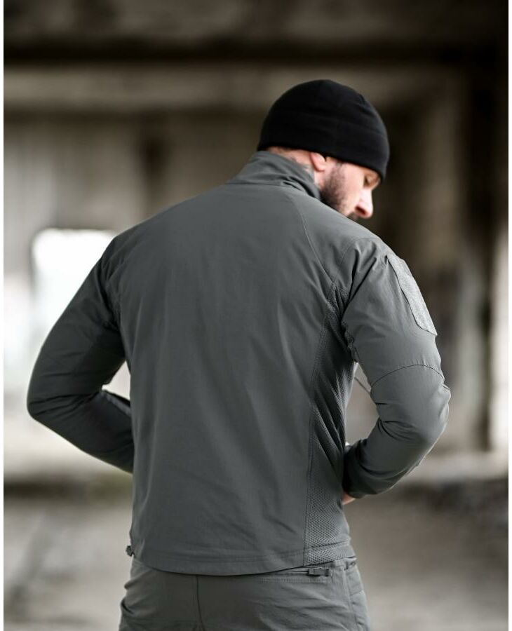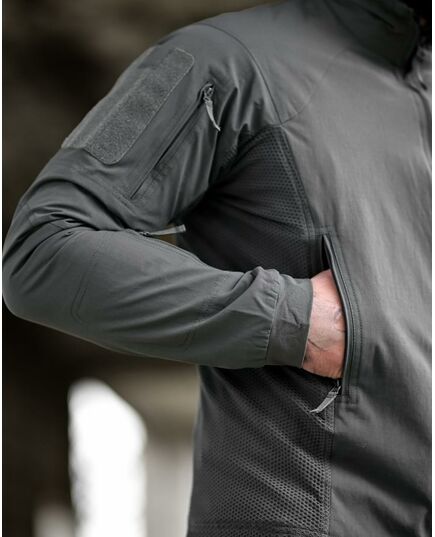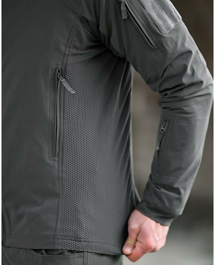 Боковые панели из нейлоновой сетки разработаны для активных пользователей, обеспечивая эффективную вентиляцию и воздухопроницаемость ткани, что снижает риск перегрева во время интенсивной активности. Высокая стойкость к истиранию делает куртку идеальной для использования с рюкзаком или тактическим жилетом. Высокий воротник с защитой подбородка и эластичные манжеты повышают комфорт при носке. Молния, используемая в основной застежке, увеличивает функциональность.