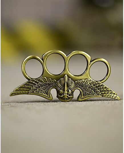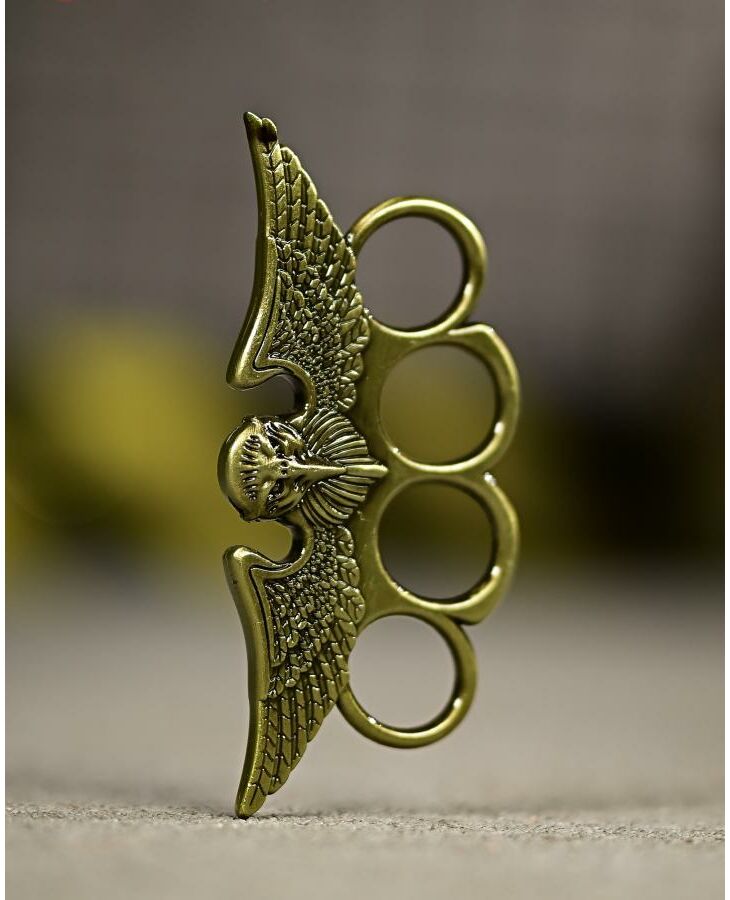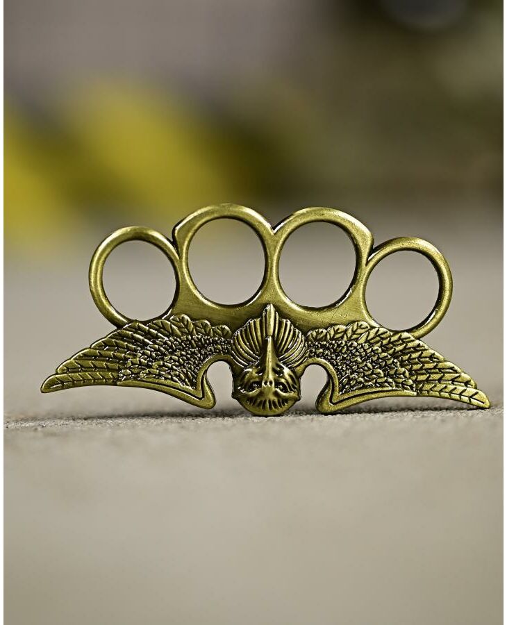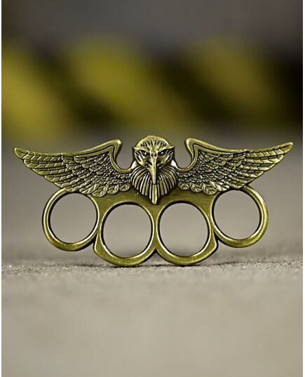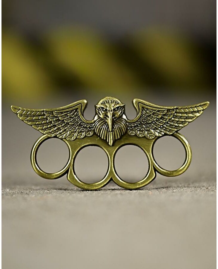 Кастет выполнен из прочного металлического сплава и отличается высокой жёсткостью конструкции. Рельефная фигура орла в центральной части подчёркивает брутальный стиль и добавляет изделию визуальной глубины. Декоративные элементы по краям усиливают общий характерный образ.