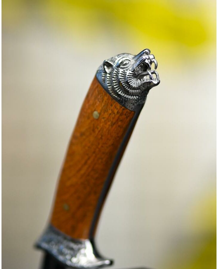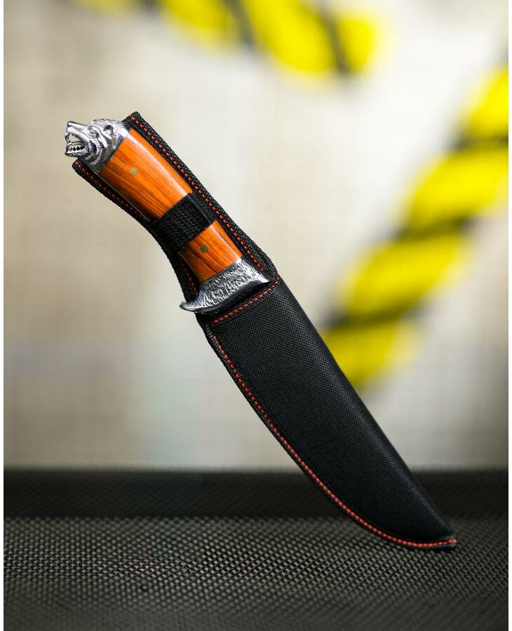 - Тыльник ножа: украшен изысканным литым изображением головы волка, символизирующим силу, свободу и охотничий дух.