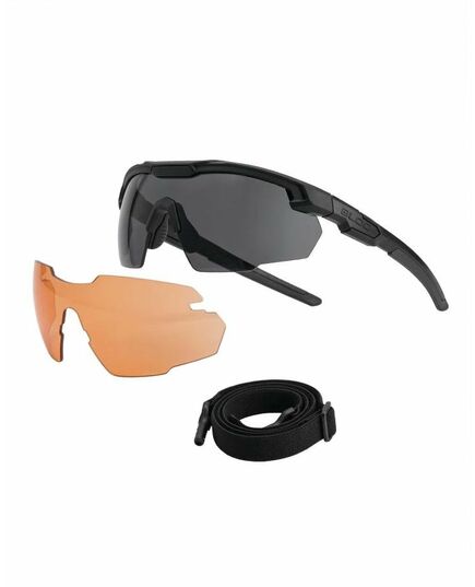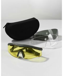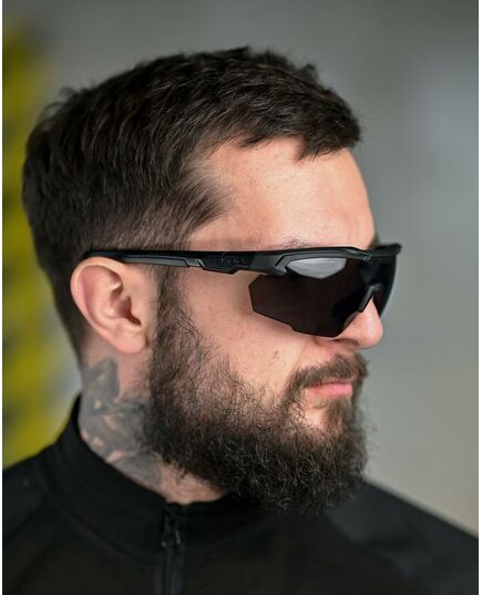 Комплект включает три сменные линзы: прозрачную (для слабого освещения), дымчато-черную (для яркого солнца) и желтую (для повышения контраста в сумерках или тумане). Линзы изготовлены из поликарбоната толщиной 2.2 мм, что обеспечивает защиту от осколков, пыли, песка и 100% защиту от UVA/UVB-лучей. Они соответствуют стандартам баллистической защиты EN 166 и ANSI Z87.1, а также имеют покрытие против запотевания и царапин. Оправа из прочного пластика обеспечивает легкость (около 30 г) и комфорт, а регулируемые носовые упоры и резиновые заушники гарантируют плотную посадку.