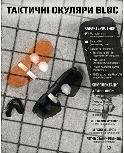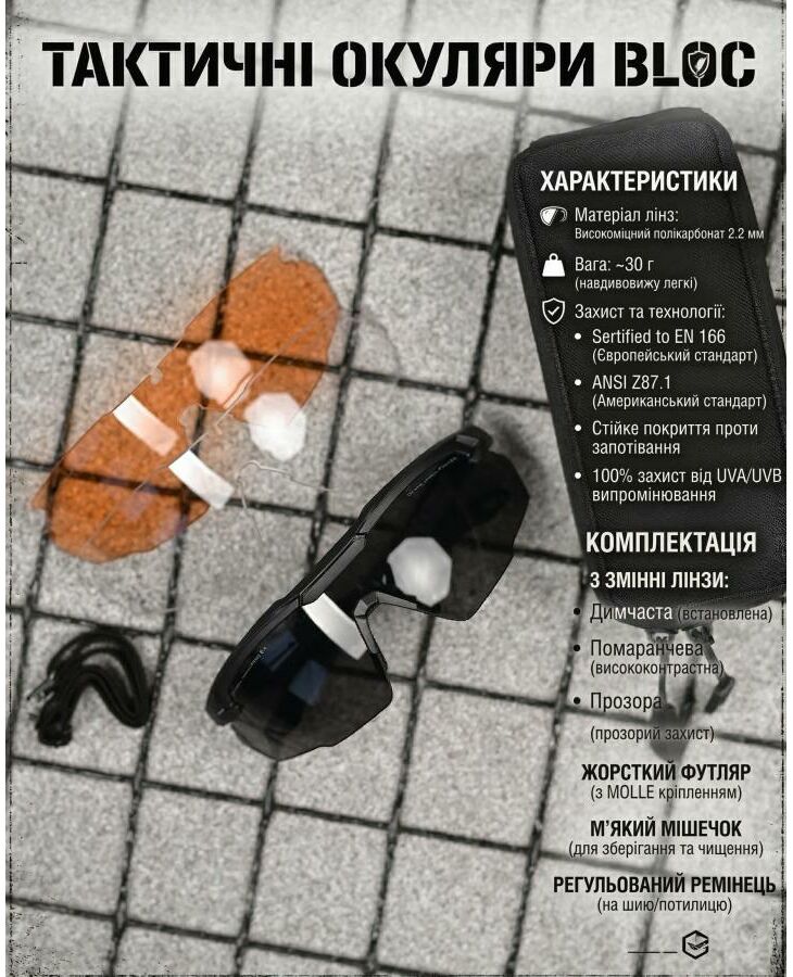 Очки тактические защитные BLOC со сменными линзами Черный — это высококачественные баллистические очки от британского бренда BLOC, известного своей оптикой для экстремальных условий. Они предназначены для военных, стрелков, правоохранителей, а также для любителей активного отдыха, таких как охотники или спортсмены.