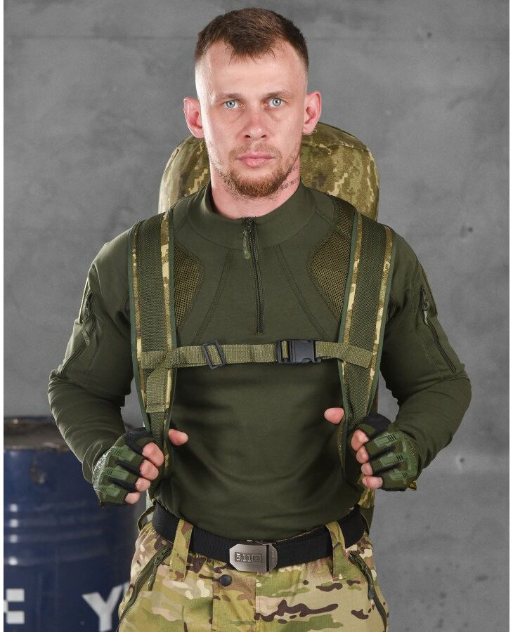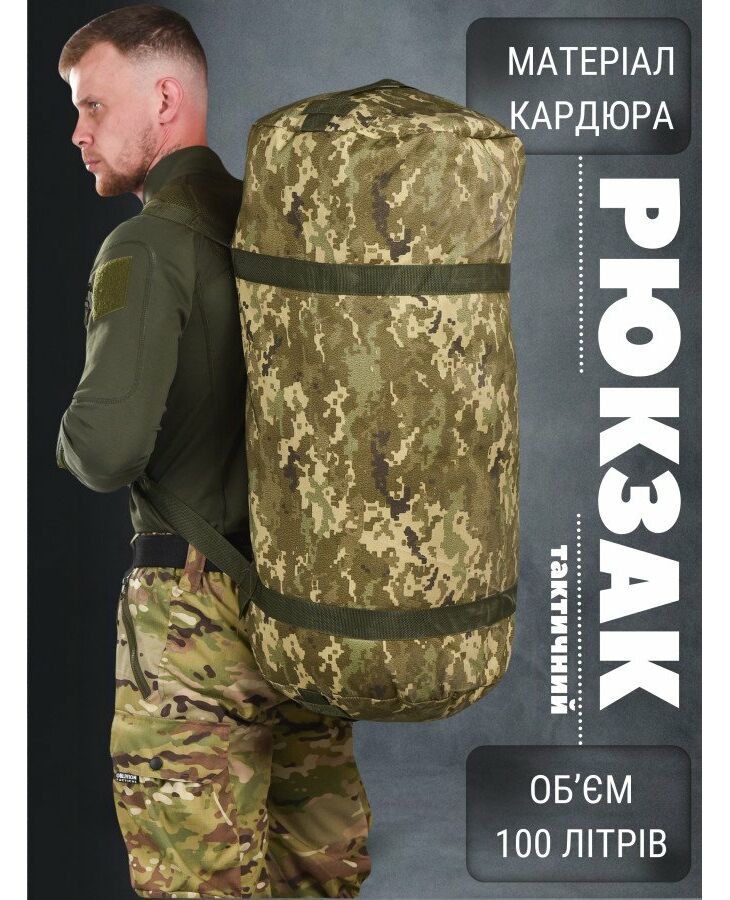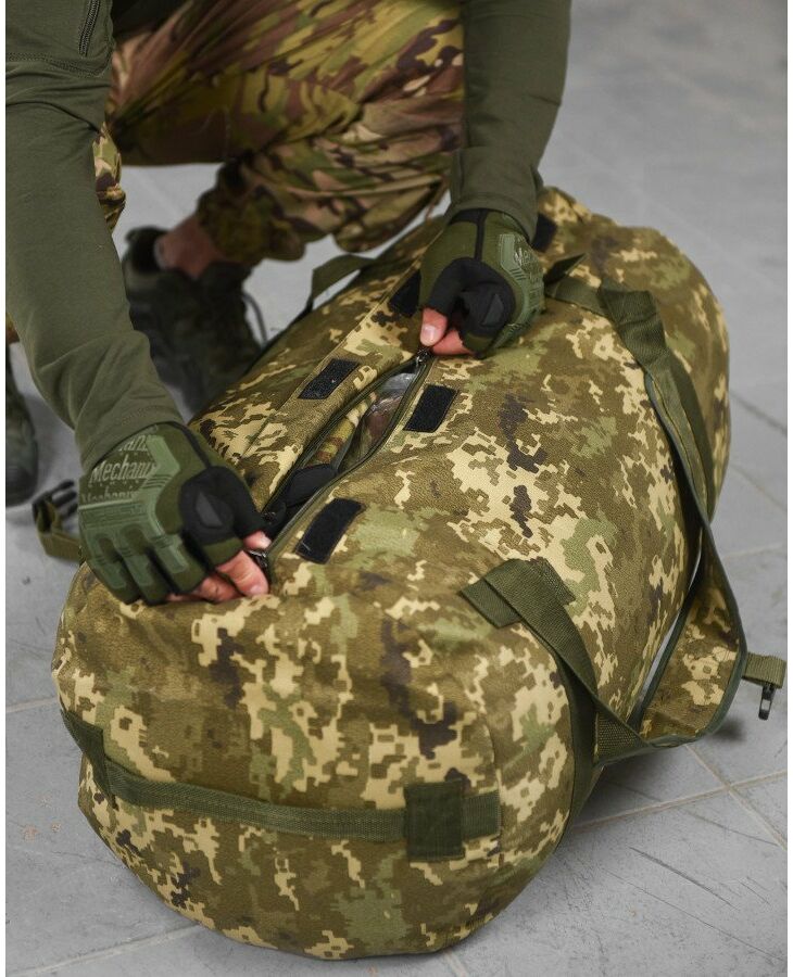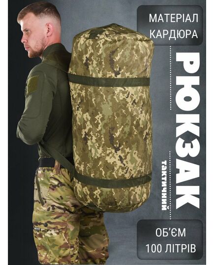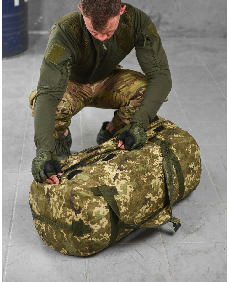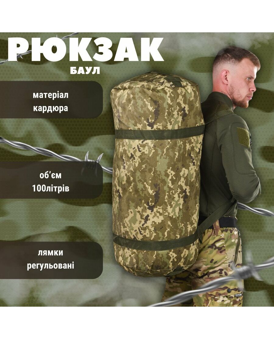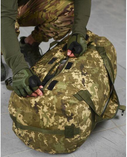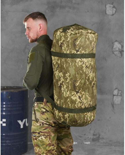 Сумка-баул призначена для перенесення особистих речей. Особливістю цієї моделі є те, що її можна носити як сумку та рюкзак. Виконана з міцної тканини піксельного забарвлення.