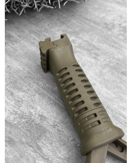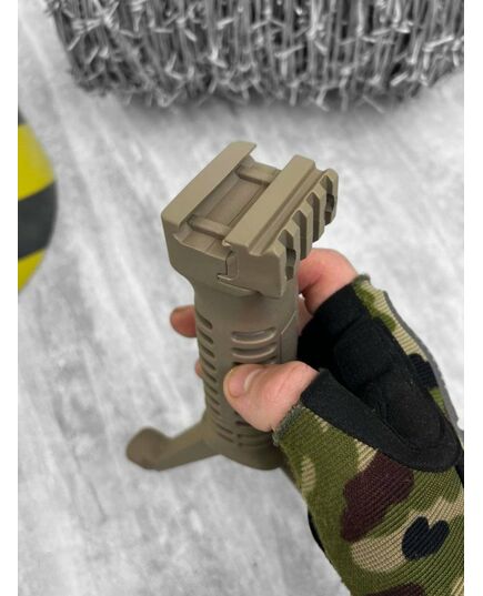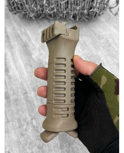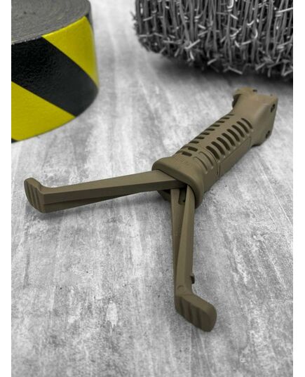 Прорізи на корпусі виконують не тільки функцію протектора, а й забезпечує вільну вентиляцію долоні; рукою здавити їх ніжки - під дією пружини вони розкладуться автоматично. Щоб не сталося випадкового складання, поверніть основу рукоятки за годинниковою стрілкою; Тактична рукоятка-сошки забезпечена додатковою планкою Pikatinny на 4 кроки, що дозволяє розмістити на ній ЛЦУ або ліхтар; Невелика маса слабко впливає на баланс і влаштує навіть тих , хто уникає обтяження карабіну.