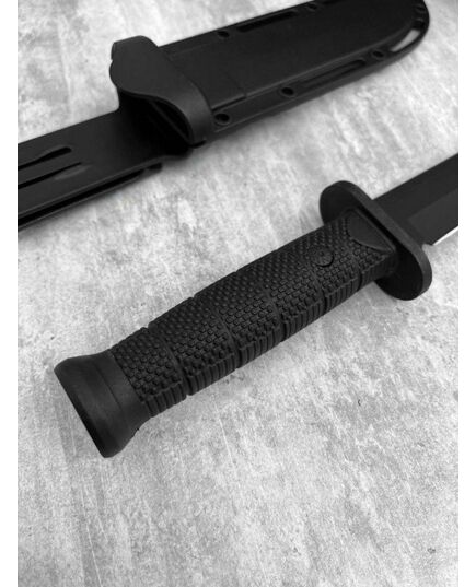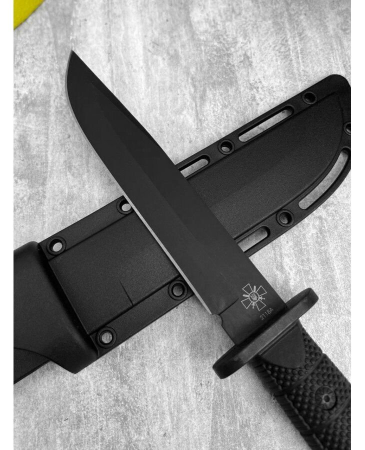 Опис Ніж 2118А з фіксованим клинком Чорний (ТН1020) Характеристики: Матеріал леза: 440C Мінімальна жорсткість леза: 56 HRC Тип ріжучої кромки: звичайна кромка Матеріал рукояті: гума Країна-виробник: Китай Довжина клинка. Товщина леза: 3 мм Загальна довжина: 300 мм Ширина леза: 31 мм Вага: 200 г...