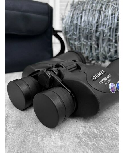 - У комплект входять: бінокль COMET 10x50, ковпачки — 4 шт., футляр з ремінцем, серветка для чищення, ремінець для підвішування бінокля на шию та картонна коробка.