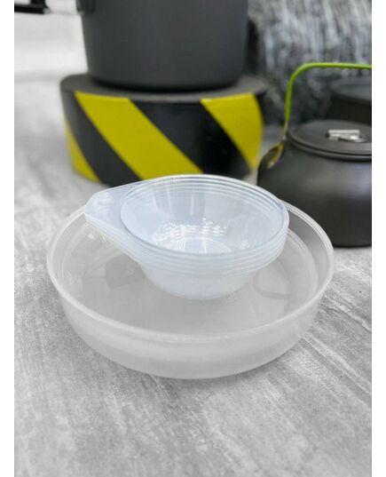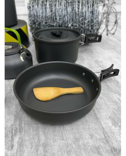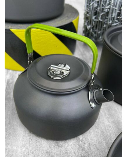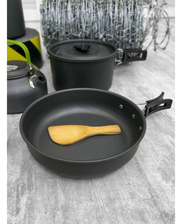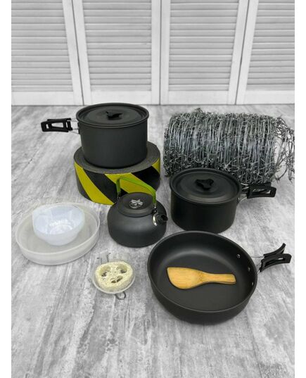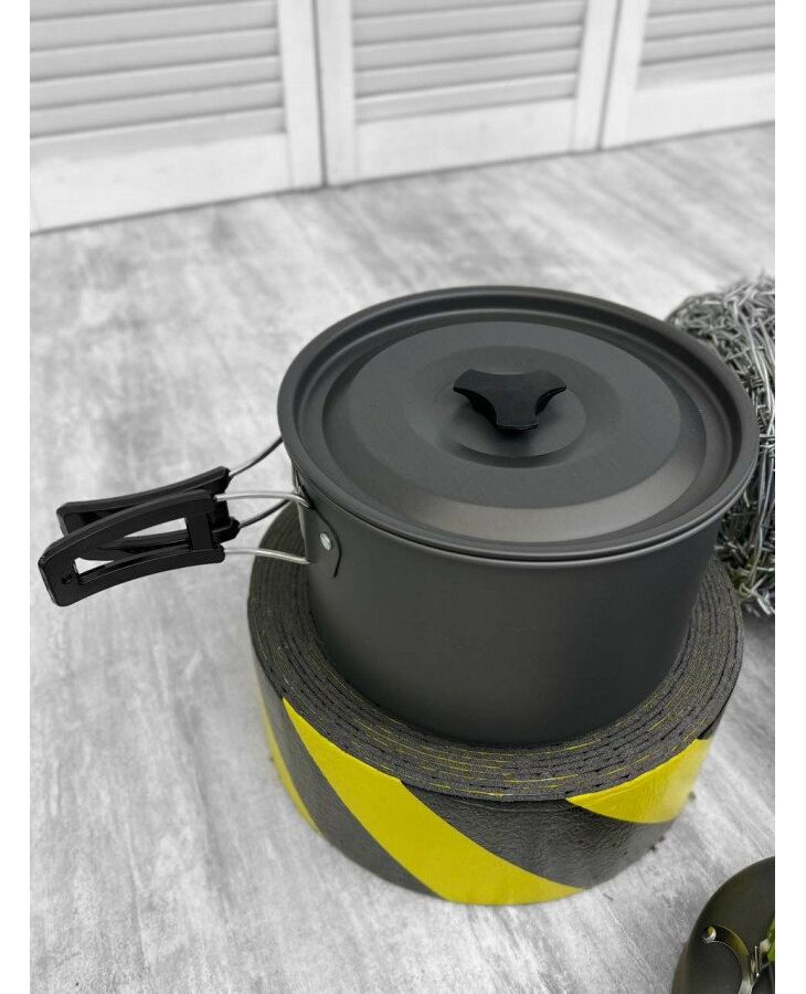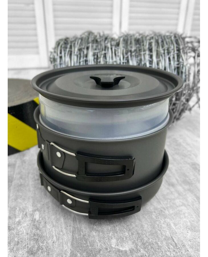 Набір туристичного, похідного посуду з анодованого алюмінію для використання з різноманітними пальниками та примусами.