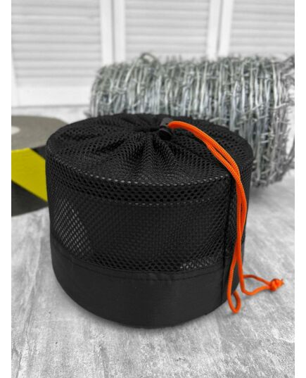 У набір входять:nbsp; три котелка (каструлі) з кришками, одна містка сковорідка. Весь посуд оснащений складними ручками-метеликами з ізоляцією (щоб не обпалити руки). . Весь комплект ховається в сітчастий чохол, складається дуже компактно.