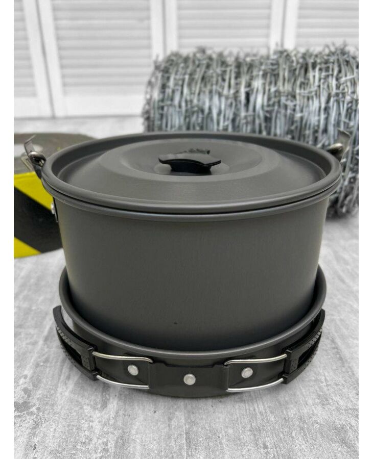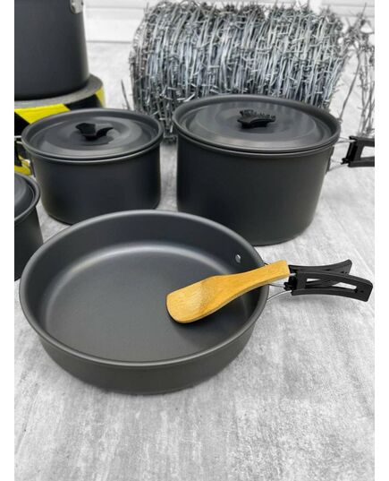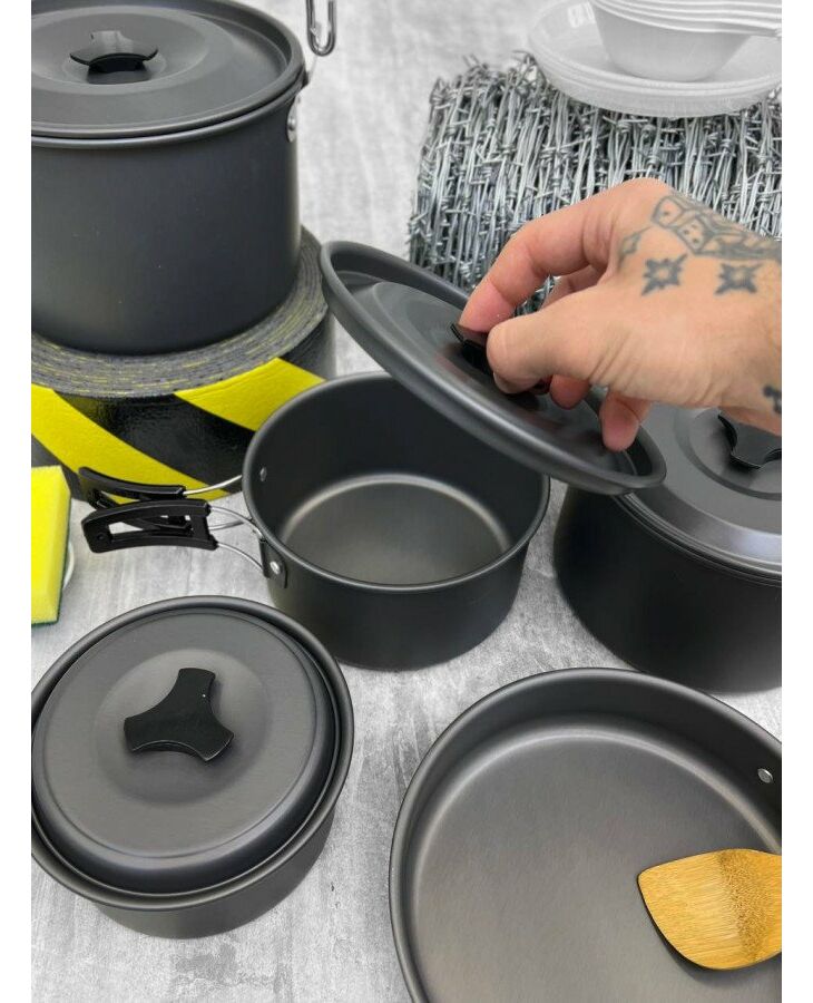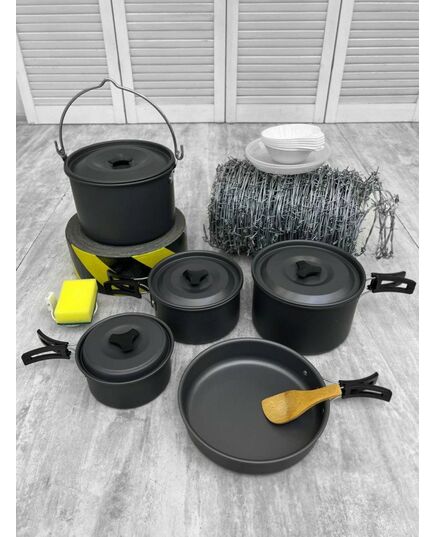Набір посуду включає чотири ємності, половник, ложку, губку для миття посуду. Є також чохол для зберігання та перенесення виробів. Дуже зручний комплект для туристичних цілей. Сюди увійшли три каструльки, казанок та сковорідка. Всі ці предмети можуть бути компактно складені один в один і не займатимуть багато місця у рюкзаку. Комплект допоможе зробити процес кулінарії на природі більш простим і швидким.
