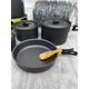Ручки посуду можуть легко складатися, що сприяє ще більшій зручності. Комплект чудово адаптований для експлуатації у польових умовах. Для виготовлення виробів застосовували вогнестійкий пластик та алюміній. Завдяки цьому посуд вийшов міцним і стійким до зовнішніх впливів.
