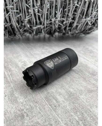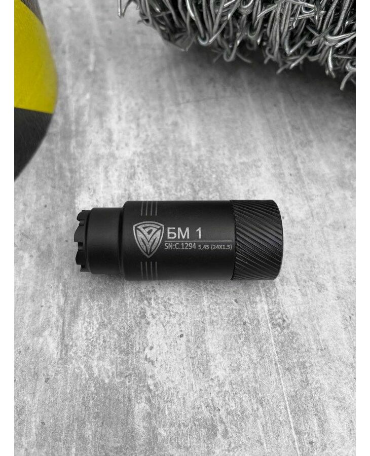 Пламегасник БМ1 5.45, різьблення – м24×1.5, пламегасник АК-74 БМ1 – це високоякісний, ефективний та міцний пламегасник, який в першу чергу розрахований для застосування військовими. Нові пламегасники БМ1 та БМ2 були розроблені у 2023 році із застосуванням нових конструкційних рішень, щоб забезпечити найкращі характеристики. Крім придушення полум'я пострілу (придушення спалаху на 99.5%), полум'ягасник БМ також підвищує точність пострілу завдяки пом'якшенню виходу газів та зниження віддачі. Пламегасник БМ1 виготовлений із високоякісної сталі 40Х (конструкційна легована сталь, призначена для виробництва деталей підвищеної міцності), яка забезпечує тривалий термін служби та високі показники демпфування. Шийка БМ1 оснащена наднадійним фіксатором, який запобігає розкручування та забезпечує стабільну інтенсивну стрілянину. Пламегасник зроблений у Миколаєві, Україна компанією "Броня Миколаїв", яка є першим в Україні серійним виробником бойових глушників та пламегасників (з 2014 року). Вироби БМ спочатку спроектовані для використання в умовах жорстких бойових дій та використовуються у всіх родах військ. Кожен пламегасник має свій індивідуальний номер та гарантійний талон. Характеристики Калібр: 5.45 мм Тип зброї: АКС-74У, АК-74, АКС-74 та їх модифікації Різьба: M24x1.5 Загальна довжина: 85 мм Діаметр: 35 мм Матеріал: сталь 40Х Вага: 210 г Ресурс (за заявою виробника) : більше 20000 пострілів
