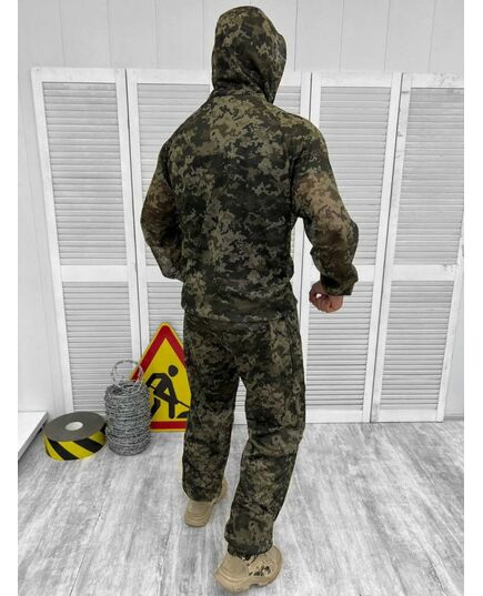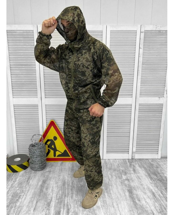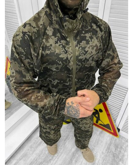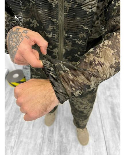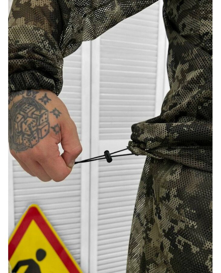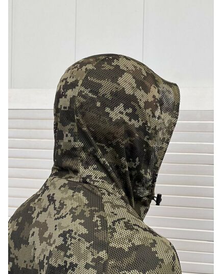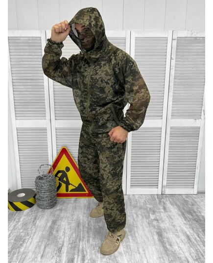 Костюм виконаний з надійної, антимоскітної сітки яка має унікальну конструкцію Grid in Grid, це  плетіння із дуже маленькими відчинками різної геометрії, що унеможливлює проникнення москітів, кліщів, та інших насекомих. На рукавах присутні утяжки з пластиковими фіксаторами, а на капюшоні сітка регулюється застібкою-блискавкою.
