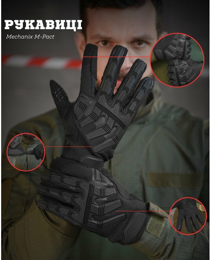 Рукавички Mechanix M-Pact дуже комфортними і включає в себе: бічні панелі з матеріалу, що тягнеться, для зручного обхвату пальців і кисті, формовані манжети для фіксації зап'ястя, гумові панелі, що захищають пальці.