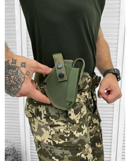 • Кобура виготовлена із щільної  тканини oxford чорного кольору щільністю 600d. На тильній стороні кобури нашата міцна накладка для носіння на звичайному або тактичному ремені шириною до 50 мм.