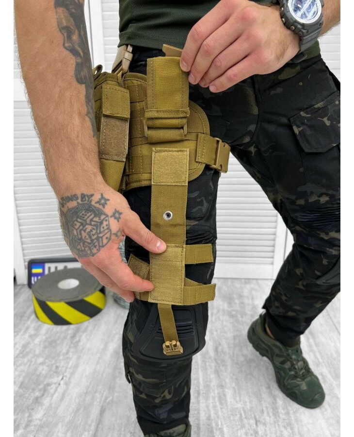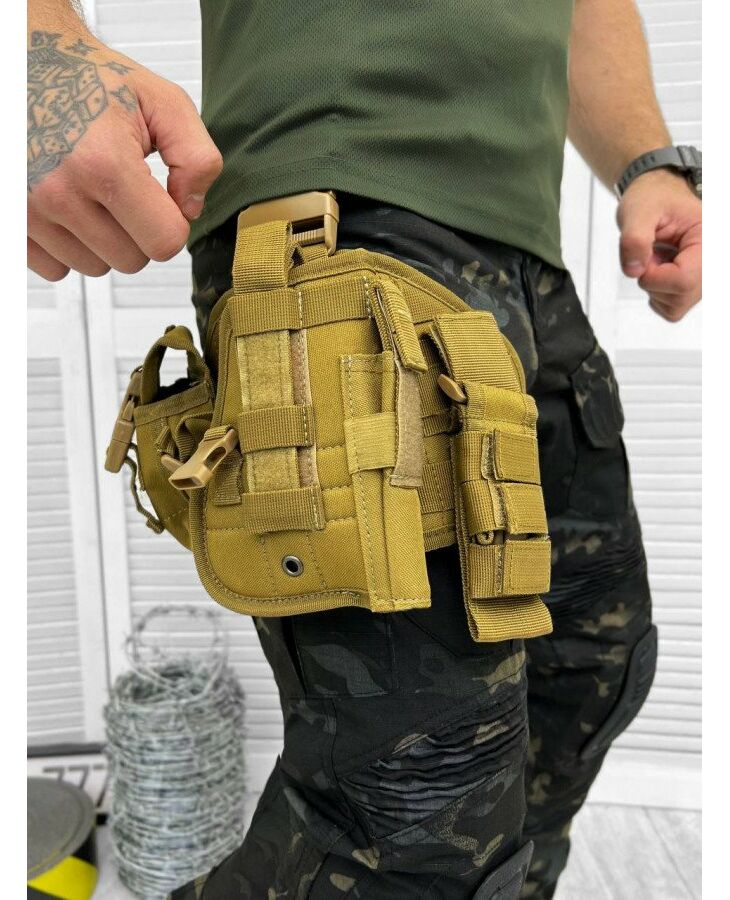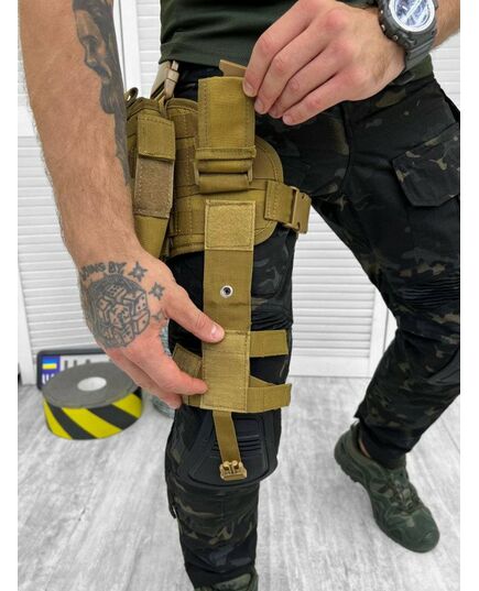 Тактична настегнана пістолетна кобура на платформі MOLLE. Розрахована для використання на правій нозі. Кобуру та підсумки можна відстебнути від платформи. До стегна платформа кріпиться двома еластичними ременями. Також є кріплення на пояс шириною до 6 см.