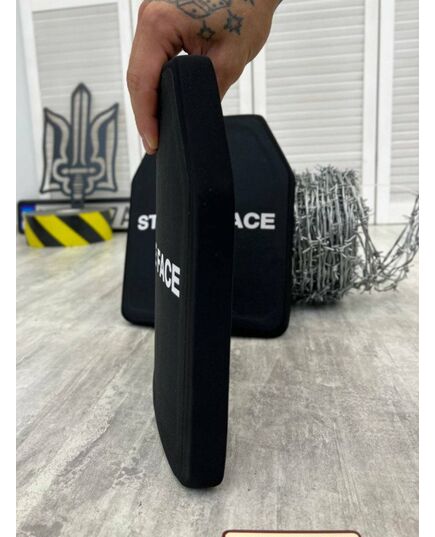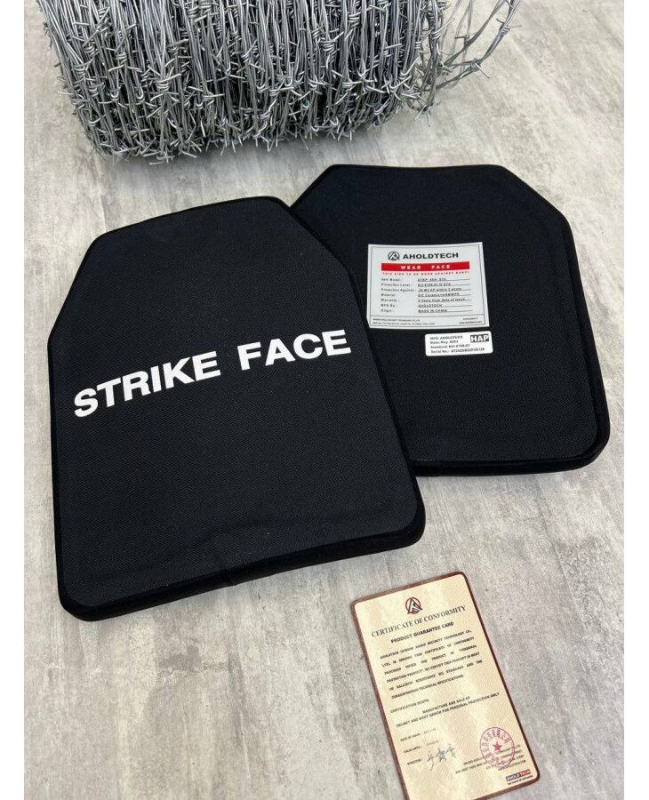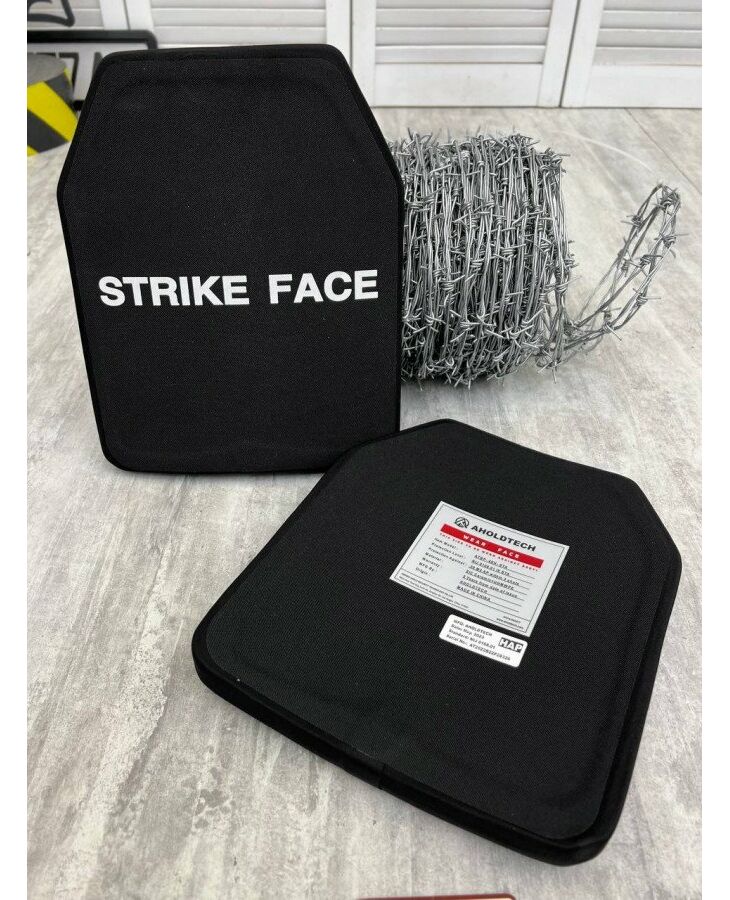 Захисна керамічна бронеплита Strike Face 6 клас (6 клас ДСТУ) відноситься до індивідуального бронезахисту високого рівня. Вага до 6 кг. У складі кераміки + UHWMPE надвисокомолекулярний поліетилен - термопластичний полімер, що тримає потрапляння бронебійної кулі. Комплектність лоту-2 плити.