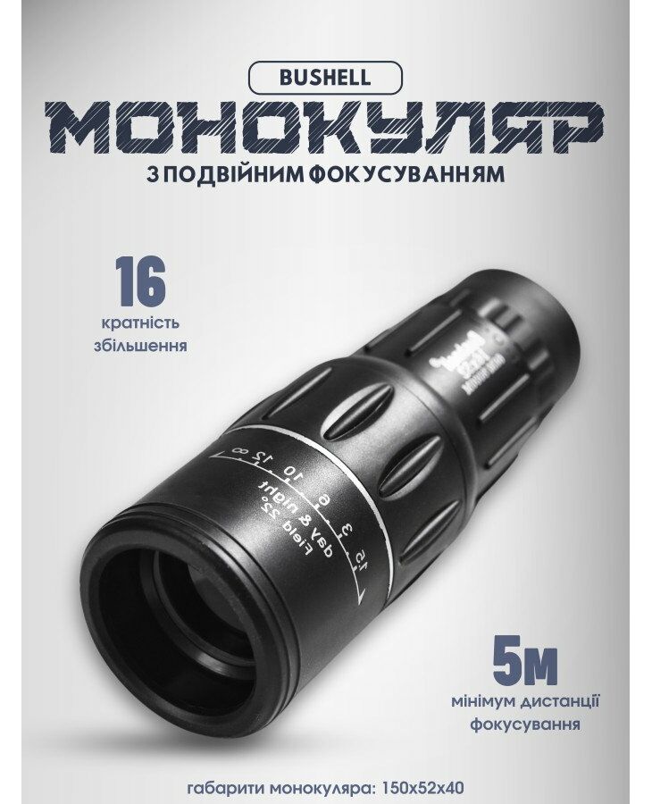 Монокуляр для полювання 16х52 з подвійним фокусуванням ви зможете розглянути все, що захочете, будь-яку деталь на величезній відстані. Надзвичайна потужність, легкість, компактність дозволяє брати його із собою усюди. Лінзи з високоякісного скла з 16-кратним збільшенням роблять картинку чіткою та яскравою. Він не боїться ні вологи, ні ударів.