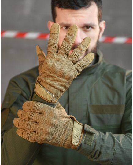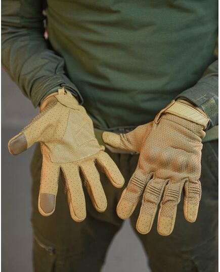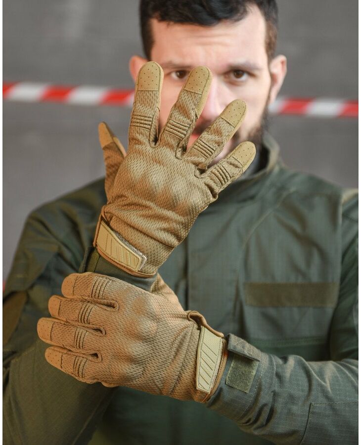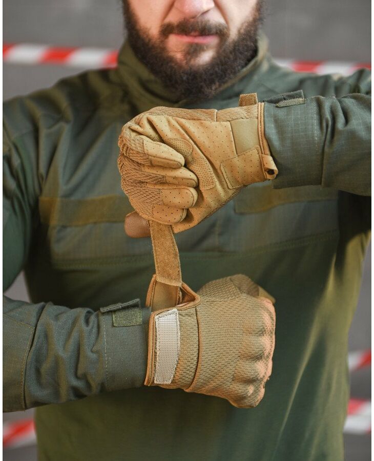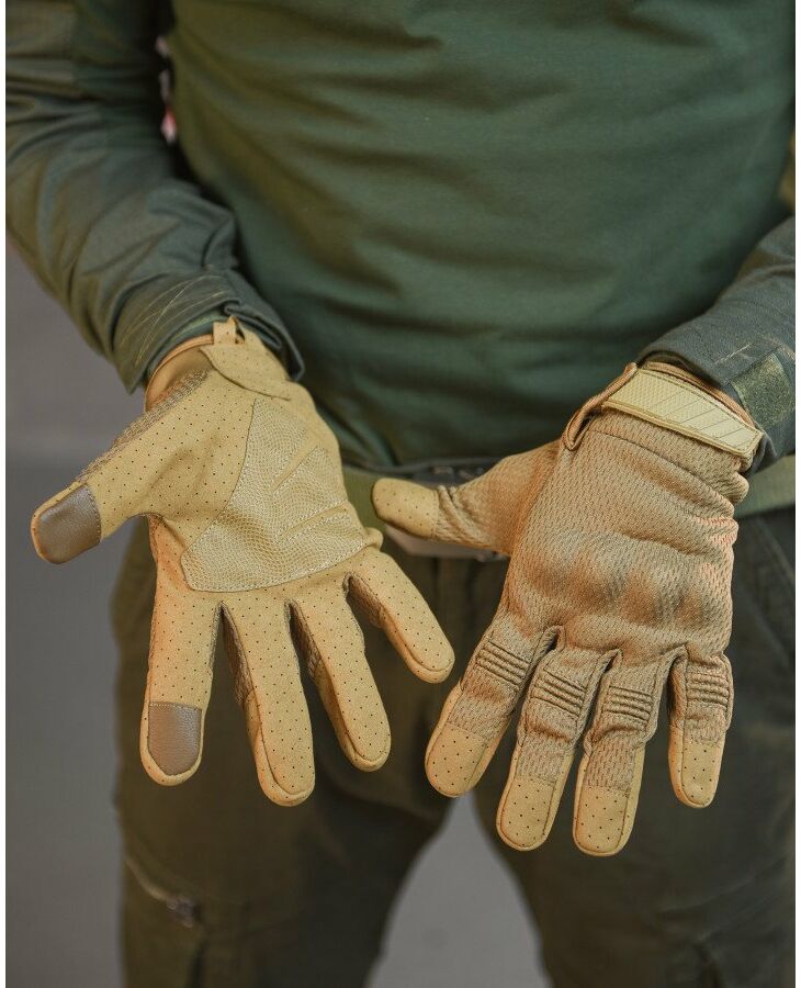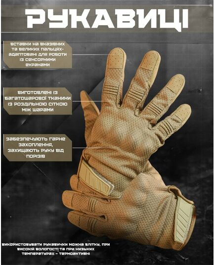 Високоякісні тактичні рукавички на повний палець – протиковзкі, вітри захисні протиковзкі, вітрозахисні, зносостійкі, з сенсорним екраном, що дихає, зносостійкі, з сенсорним екраном, що дихає. Рукавички забезпечують гарне захоплення, захищають руку від порізів. Використовувати рукавички можна влітку, при високій вологості та при осінніх температурах – термоактивні. Завдяки вставкам на вказівних та великих пальцях вони адаптовані для роботи із сенсорними екранами. Верх рукавички виготовлений із багатошарової тканини із роздільною сіткою між шарами. Взимку матеріал затримує частки гарячого повітря, а влітку дихає і швидко випаровується вологу. Внутрішня частина дозволяє легко надягати рукавички і добре вбирає піт. Повітропроникність: поліестеровий сітчастий матеріал, що облягає, робить ваші руки гнучкими, зручними, пропускає повітря. Універсальний: відмінне армійське спорядження, велосипедні рукавички, рукавички для водіння, робочі рукавички для підйому та навантаження, військові рукавички, тактичні рукавички, бойові рукавички, штурмові рукавички