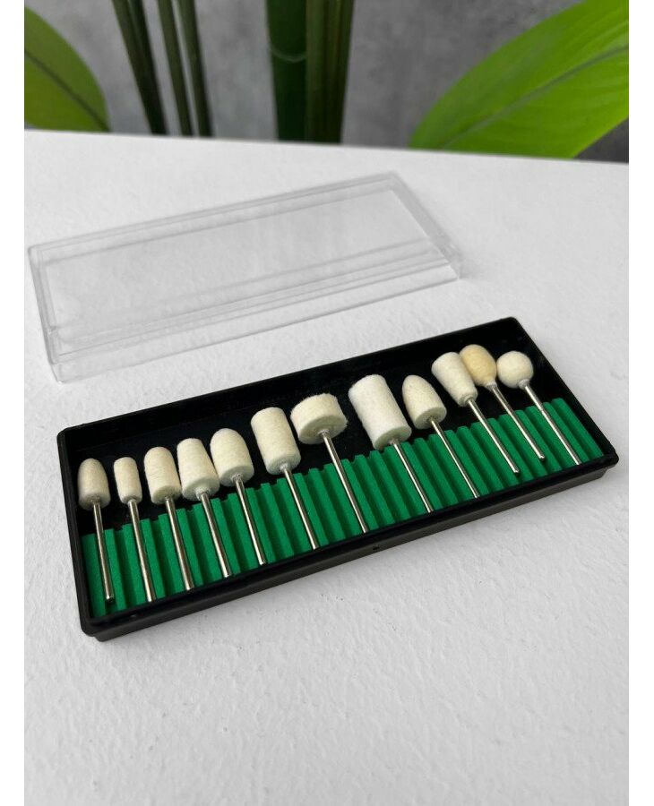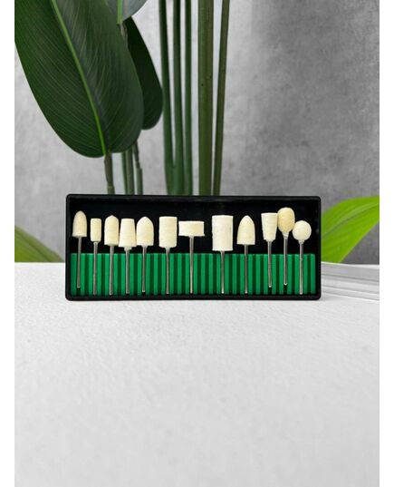 Насадки для фрезера повстяні. Використовуються в апаратному манікюрі та педикюрі. У комплекті 12 насадок (конусної, циліндричної, еліпсоподібної, овальної, круглої форми) з повсті. Призначені для надання блиску штучним та натуральним нігтям.